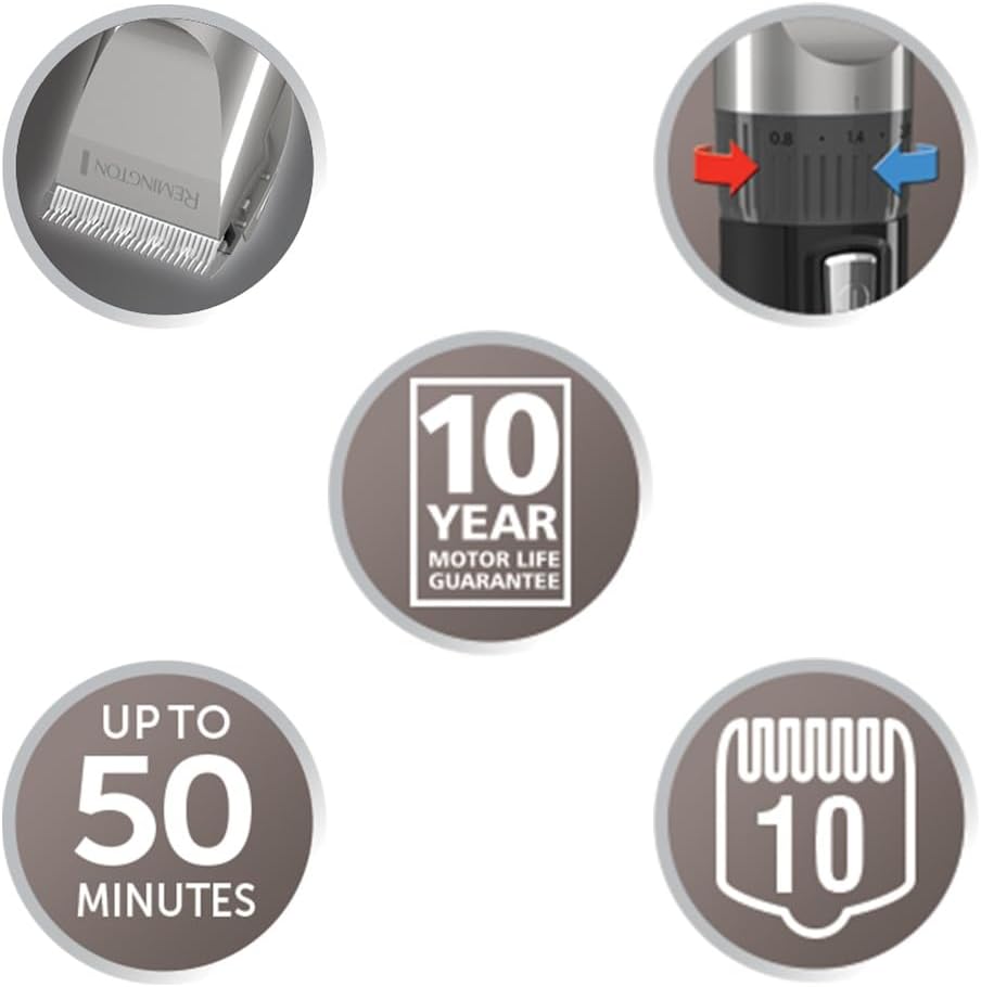 ماشین اصلاح موی حرفهای رمینگتون [تیغههای سرامیکی خود تیز شونده/0.8-40 میلیمتر/تنظیم دقیق] مجموعه ماشین اصلاح مو (10 شانه اتصال، برق/باتری، لیتیوم، جعبه آلومینیومی، شنل آرایشگری) ماشین اصلاح موی HC5811 جدید