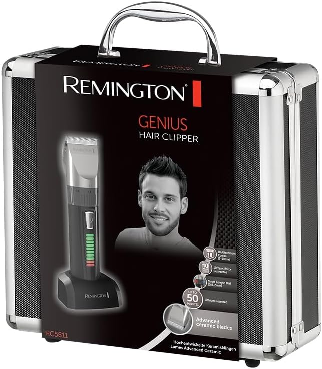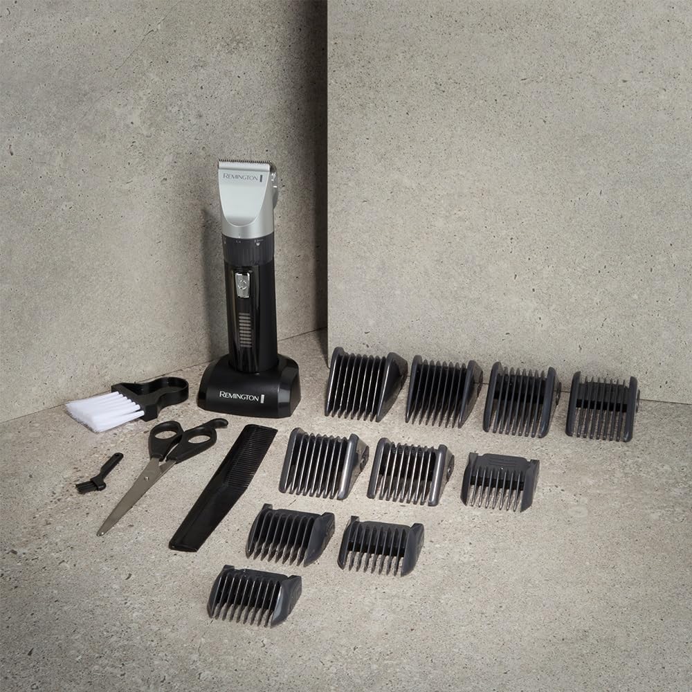 Remington Haarschneidemaschine Profi [selbstschärf. Keramik Klingen/0,8-40mm/Präzisionseinstellung] Haarschneider Set (10 Aufsteckkämme, Netz-/Akkubetrieb, Lithium, Alukoffer, Friseurumhang) HC5811 Haarschneidemaschine NEU | قیمت یورویی 34.99€
