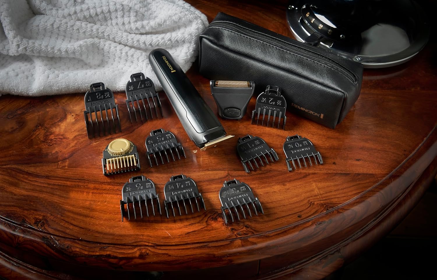 ماشین اصلاح موی حرفهای رمینگتون [عملکرد موتور توربو، باتری لیتیومی، ۴ ساعت کارکرد، برق شهری و بیسیم] سری T، ۲ در ۱: اصلاحکننده ریش و ماشین اصلاح مو (۹ شانه ضمیمه ۱.۵-۲۵ میلیمتری و اصلاحکننده + ریش) MB7050