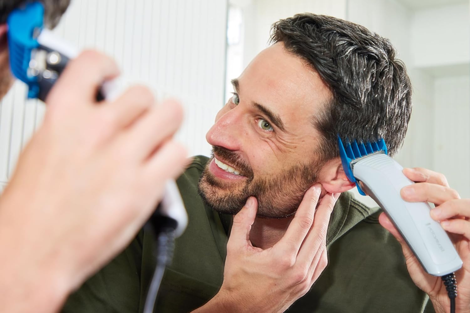 Qualitativ hochwertige, selbstschärfende Edelstahlklingen, 0,5 mm Präzisionsklinge Klingeneinstellhebel für ein exaktes Einstellen der Schneidklinge 9 farbige Aufsteckkämme für eine einfache Längeneinstellung (1,5-25 mm), Netzbetrieb 2 Aufsteckkämme zum einfachen Schneiden der Seiten, Gummierter Griff Schere, Kamm, Reinigungsbürste und Nackenhaarbürste inklusive | قیمت یورویی : 14.99€