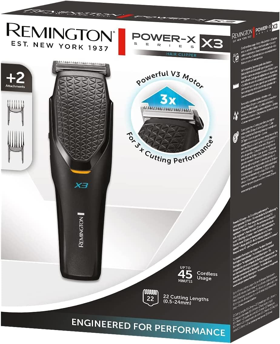 ماشین اصلاح موی رمینگتون حرفهای X3 (2 شانه اتصال قابل تنظیم 3-24 میلیمتر، تیغههای استیل ضد زنگ ژاپنی، کارکرد با برق/باتری) ماشین اصلاح مو، اصلاح کننده مو، سری Power X HC3000 X3 + 3-24 میلیمتر
