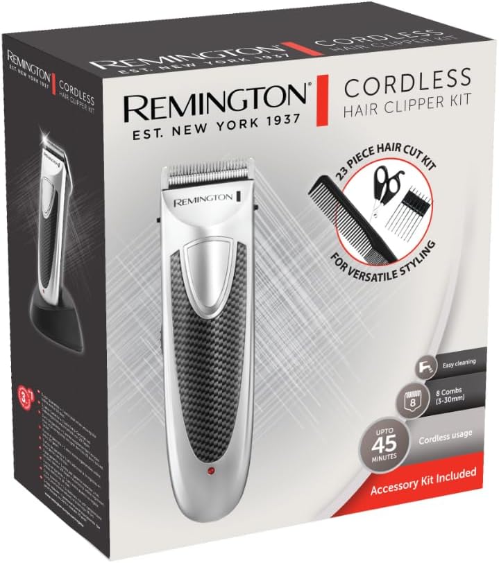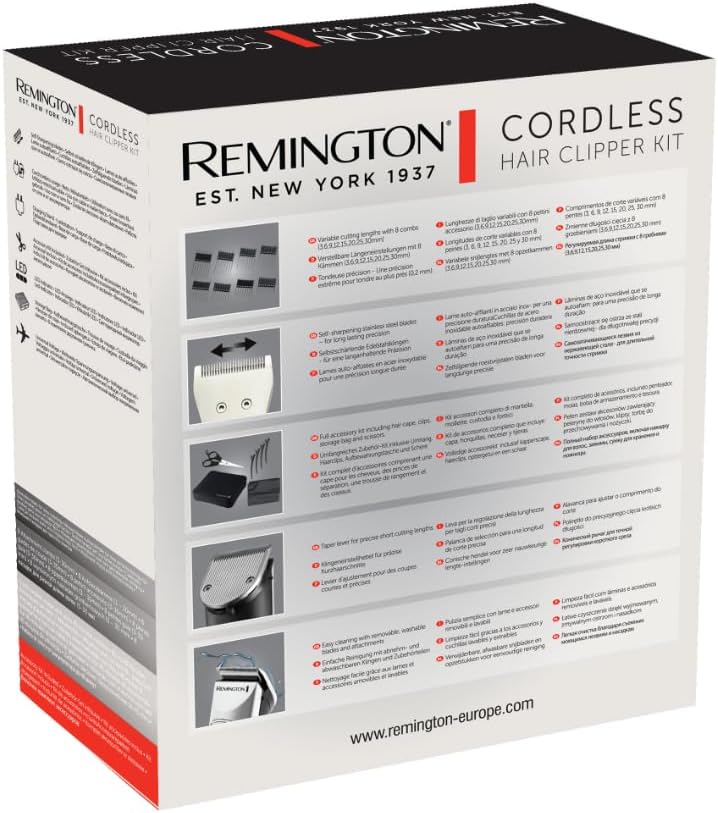 ماشین اصلاح موی رمینگتون HC4110 (تیغههای استیل ضد زنگ خود تیز شونده، 8 شانه از 3 تا 30 میلیمتر + کیف نگهداری، شنل آرایشگری و سایر لوازم جانبی، کارکرد با برق/باتری، صفحه نمایش LED)