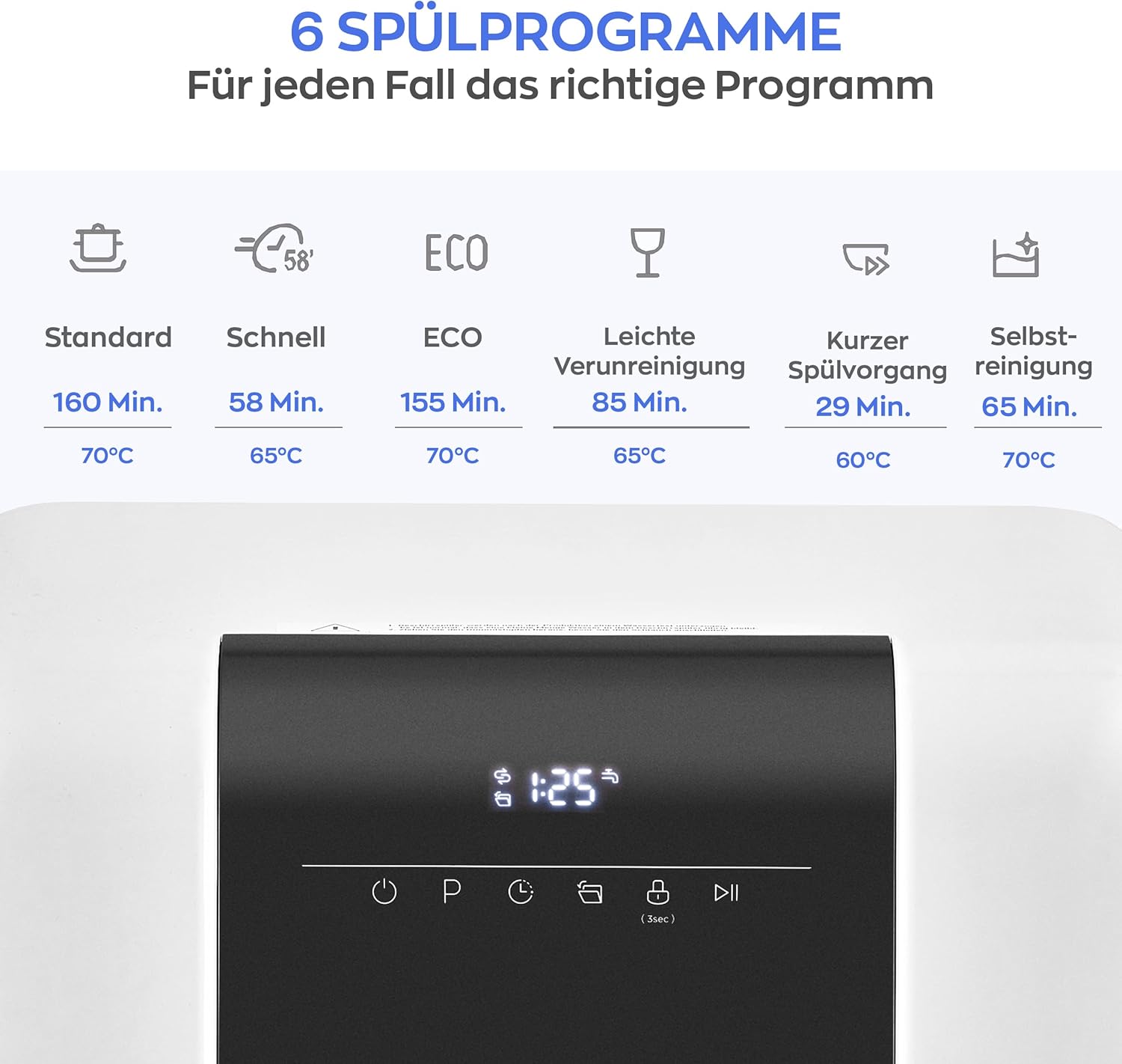 ✅ HEINRICH´S Mini Geschirrspüler - Der Tischgeschirrspüler ist bei Verwendung nahezu lautlos (nur 58 dB) und ist kompakt und benötigt nur wenig Platz. 💵 SPARSAMER LUXUS - Verbrauch pro Jahr beträgt nur 44 kWh [Energieklasse F ] -Diese Spülmaschine mit 860W Leistung reduziert den Wasserverbrauch um 70%; da er nur 6 L Wasser pro Spülvorgang verbraucht. Demnach mehr für die Haushaltskasse! 6️⃣ Programme & Funktionen: Wassertank mit 6L Wasserkapazität oder ein direkter Wasserhahnanschluss. Dieser Tischgeschirrspüler kann beides! Dank der 360°Reinigungsabdeckung spülen Sie Ihr Geschirr gründlich und sauber. Sie haben die Auswahl zwischen 6 Programmen: ECO: 155 Min., Starke Verschmutzung: 160 Min., Standard: 85 Min., Schnell: 58 Min., Kurzprogramm: 29 Min., Selbstreinigung: 65 Min 🎨KOMPAKTES DESIGN – Mit einem Touch-Display und Salzkammer, die perfekt für Ihren Zweck geeignet sind und ¬Ihnen die Reinigung erleichtert. Der Mini Geschirrspüler findet überall seinen Platz, somit entfällt Ihnen das lästige und zeitintensive Spülen und Abwaschen. 🎁Freude beim Verschenken: Überraschen Sie Ihre Liebsten mit unseren Produkten. Wir stehen Ihnen auch dort mit Rat und Tat zur Seite. | قیمت یورویی : 239.99€