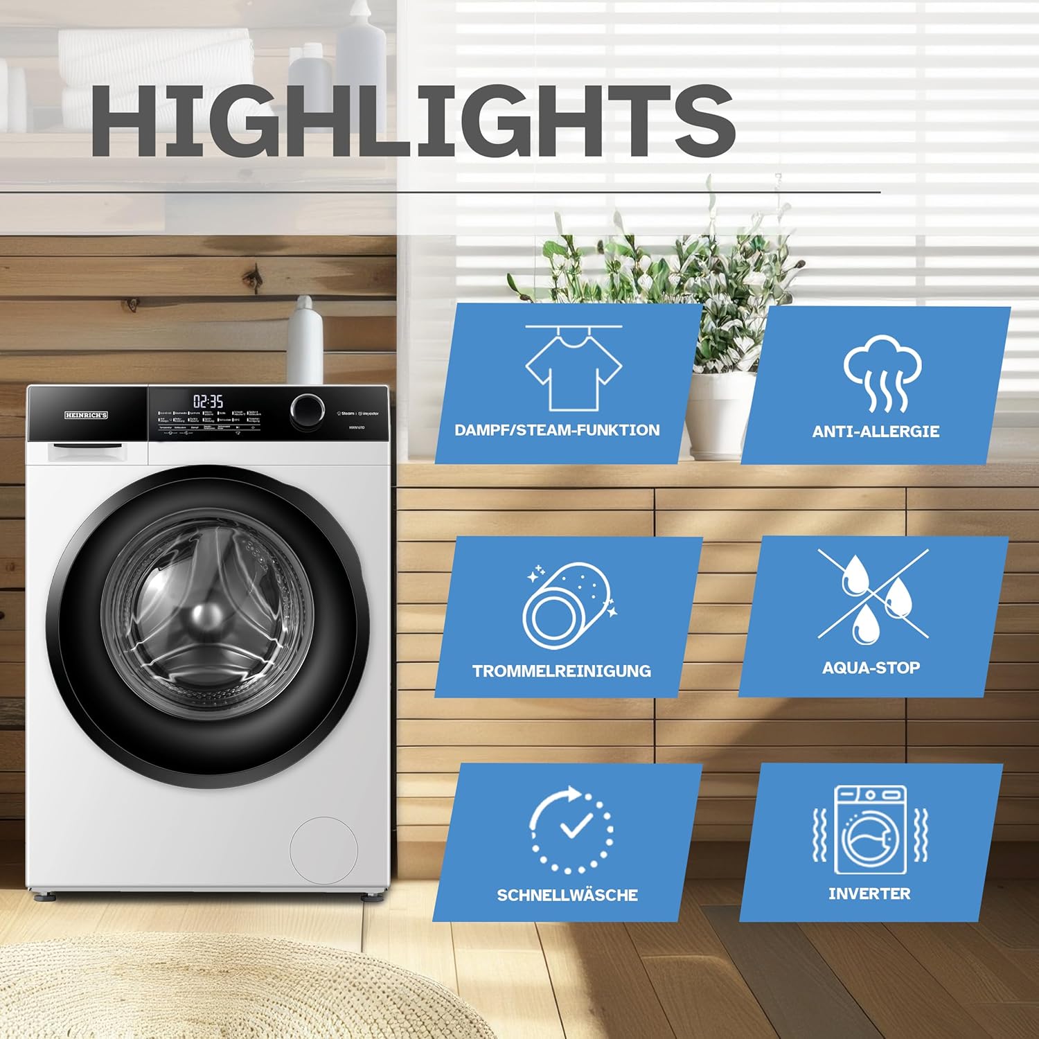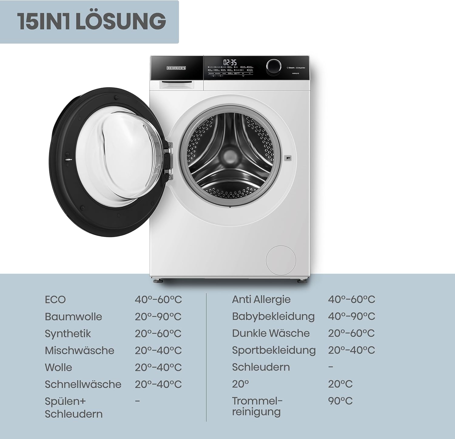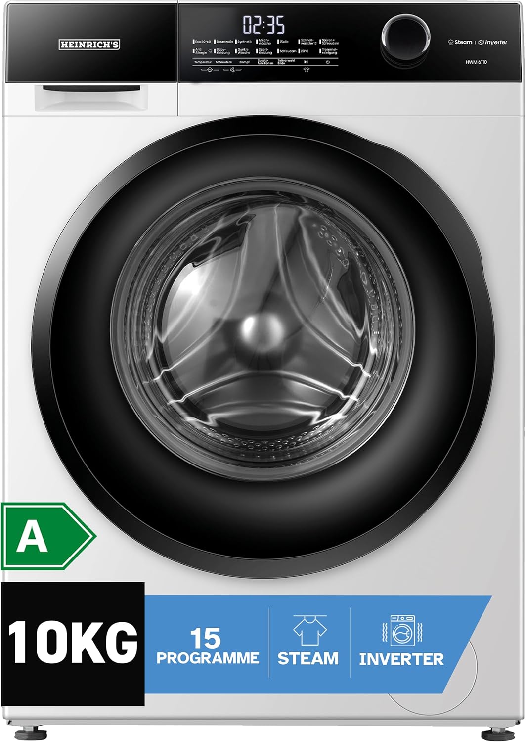 HEINRICHS Waschmaschine, Steam-Funktion, 10kg Mega Kapazität, 15 Programme, 1400 U/min., Aqua-Stop, LED-Display, Endzeitvorwahl, mit Kindersicherung, langlebiger und leiser Inverter Motor,Weiß 10 KG Weiss | قیمت یورویی 459.99€