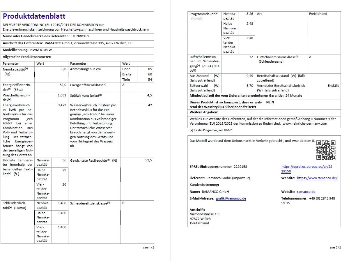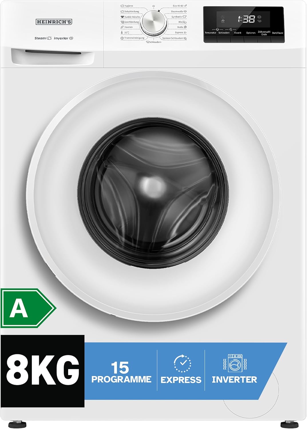 Heinrich´s Waschmaschine, 8kg, 15 Programme, 1400 U/min., Aqua-Stop, LED-Display, inkl. Timer, mit Kindersicherung, langlebiger Inverter Motor, Energieeffizienzklasse A, weiß | قیمت یورویی 395.72€