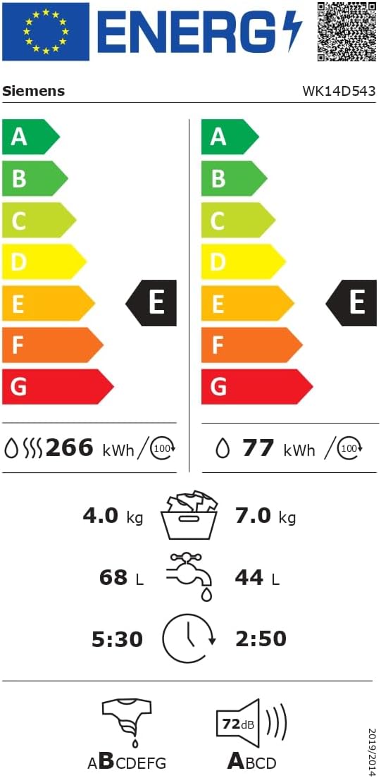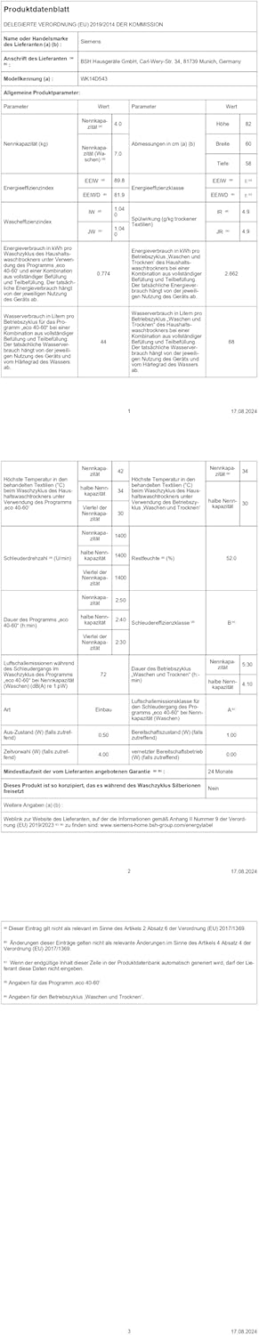 Siemens WK14D543 iQ500 Einbau-Waschtrockner, 7 kg Waschen und 4 kg Trocknen, 1400 UpM, Outdoor-Programm - trocknet wasserfeste Outdoor-Bekleidung zuverlässig, aquaStop, besonders hohe Beladungsmenge | قیمت یورویی 1119.99€