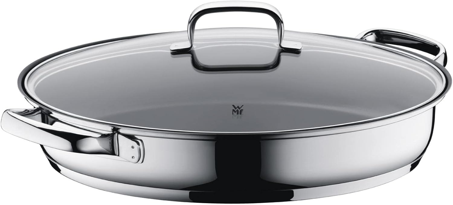 ماهیتابه بیضی شکل مخصوص کبابپزی/ماهیتابه WMF، سایز 38 در 26 سانتیمتر، با درب شیشهای، روکش استیل ضد زنگ Cromargan، سازگار با دستگاه القایی؛ ماهیتابه بیضی شکل مخصوص کبابپزی Devil، سایز 38 در 26 سانتیمتر