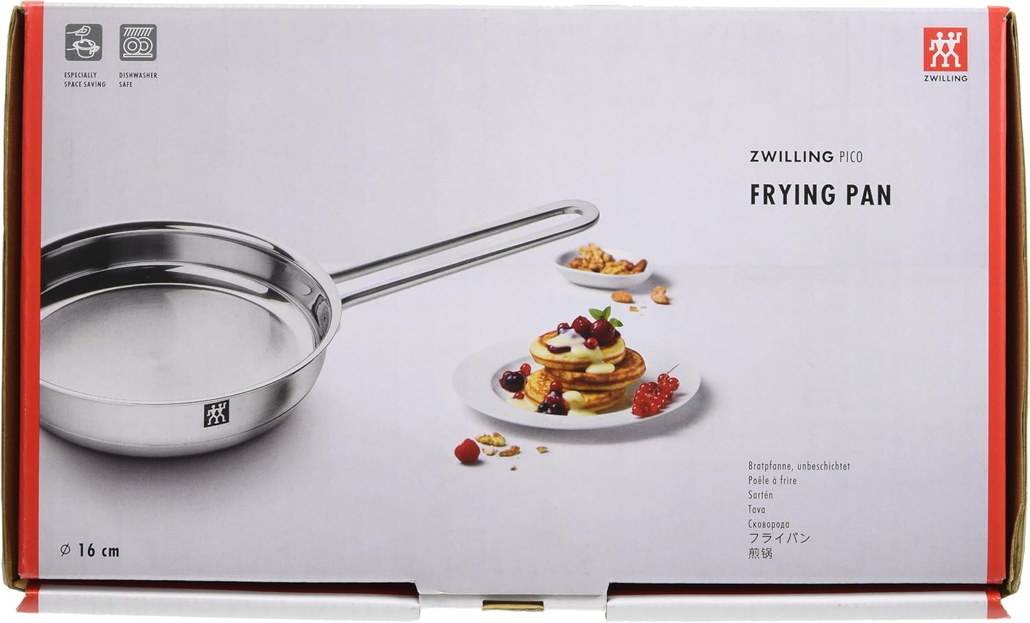ماهیتابه زولینگ آلمان zwilling Pico Pfanne در اندازهی 16 سانتیمتر و رنگ نقرهای، ابزاری کوچک و کارآمد برای پختوپز روزمره بهشمار میرود. این ماهیتابه از جنس استیل ضد زنگ تولید شده و حرارت را بهشکل یکنواخت توزیع میکند.