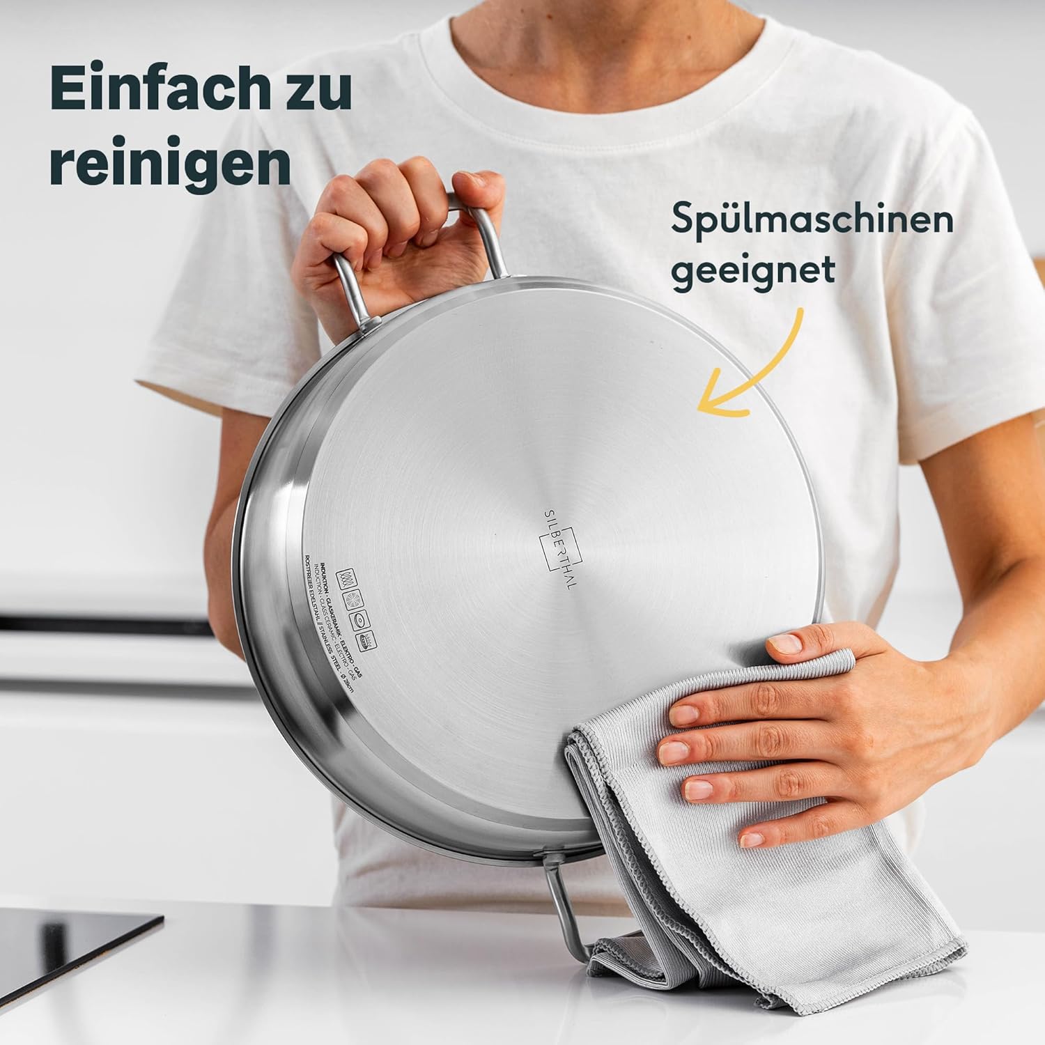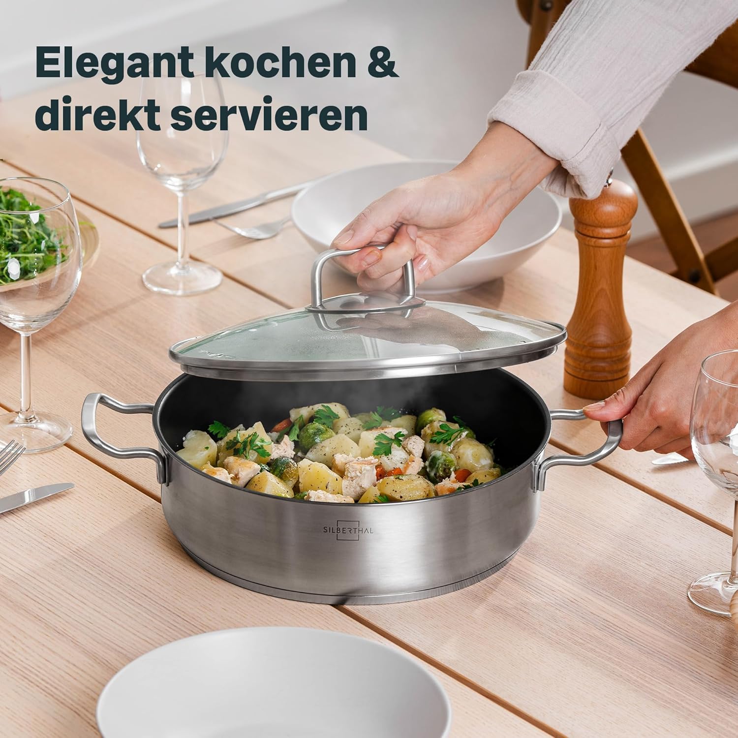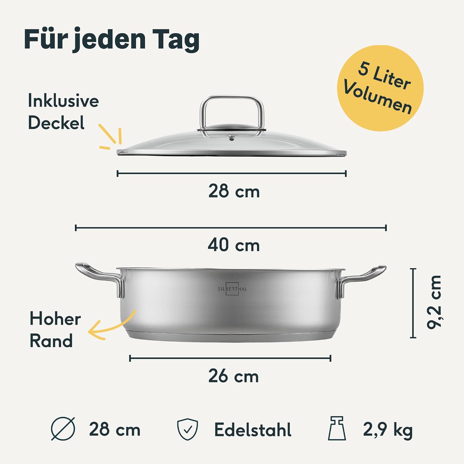 SILBERTHAL Schmorpfanne 28 cm hoher Rand - Beschichtete Servierpfanne mit Deckel - Backofengeeignet bis zu 250° - Induktionsgeeignet - 5l 28cm Beschichtet | قیمت یورویی 74.95€