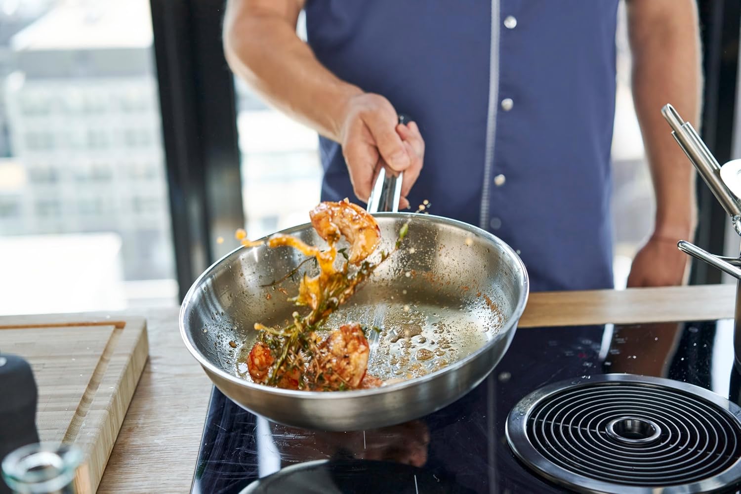 ماهیتابه زولینگ آلمان Zwilling Pro Bratpfanne 18/10 Edelstahl در قطر 28 سانتیمتر، انتخابی ایدئال برای آشپزهای خانگی و نیمهحرفهای است که به دنبال محصولی بادوام و کارآمد میگردند. استفاده از استیل ضد زنگ 18/10، پایداری در برابر خوردگی و زنگزدگی را تضمین کرده و بدنه مستحکم، توزیع حرارت را بهصورت یکنواخت در همه نقاط فراهم میکند. این ماهیتابه برای پخت انواع غذاها ازجمله گوشت، سبزیجات و غذاهای سرخکردنی حجیم مناسب بوده و دسته ارگونومیک آن، جابهجایی و کنترل بهتر را در حین آشپزی ممکن میسازد. همچنین امکان شستشو در ماشین ظرفشویی باعث میشود نظافت و نگهداری از این محصول بسیار آسان باشد.