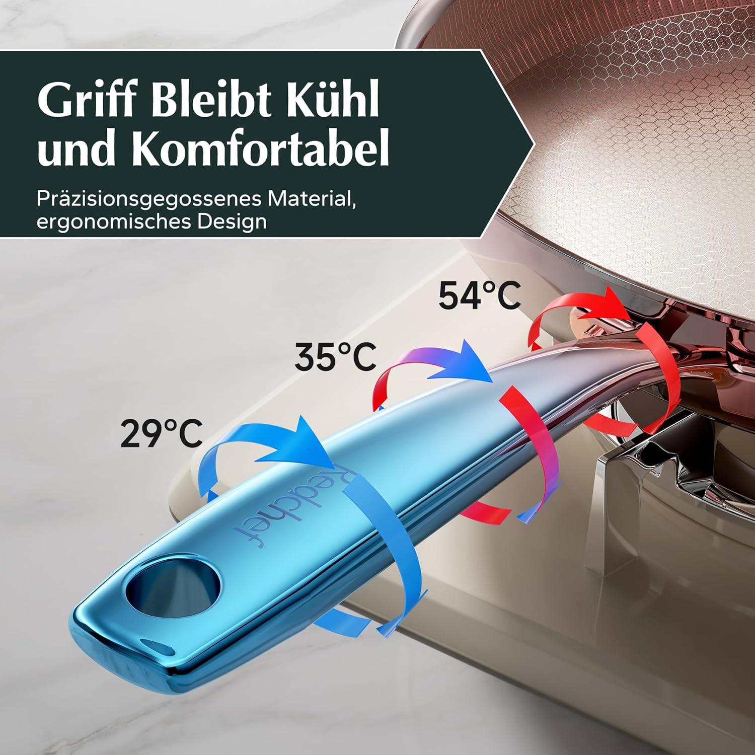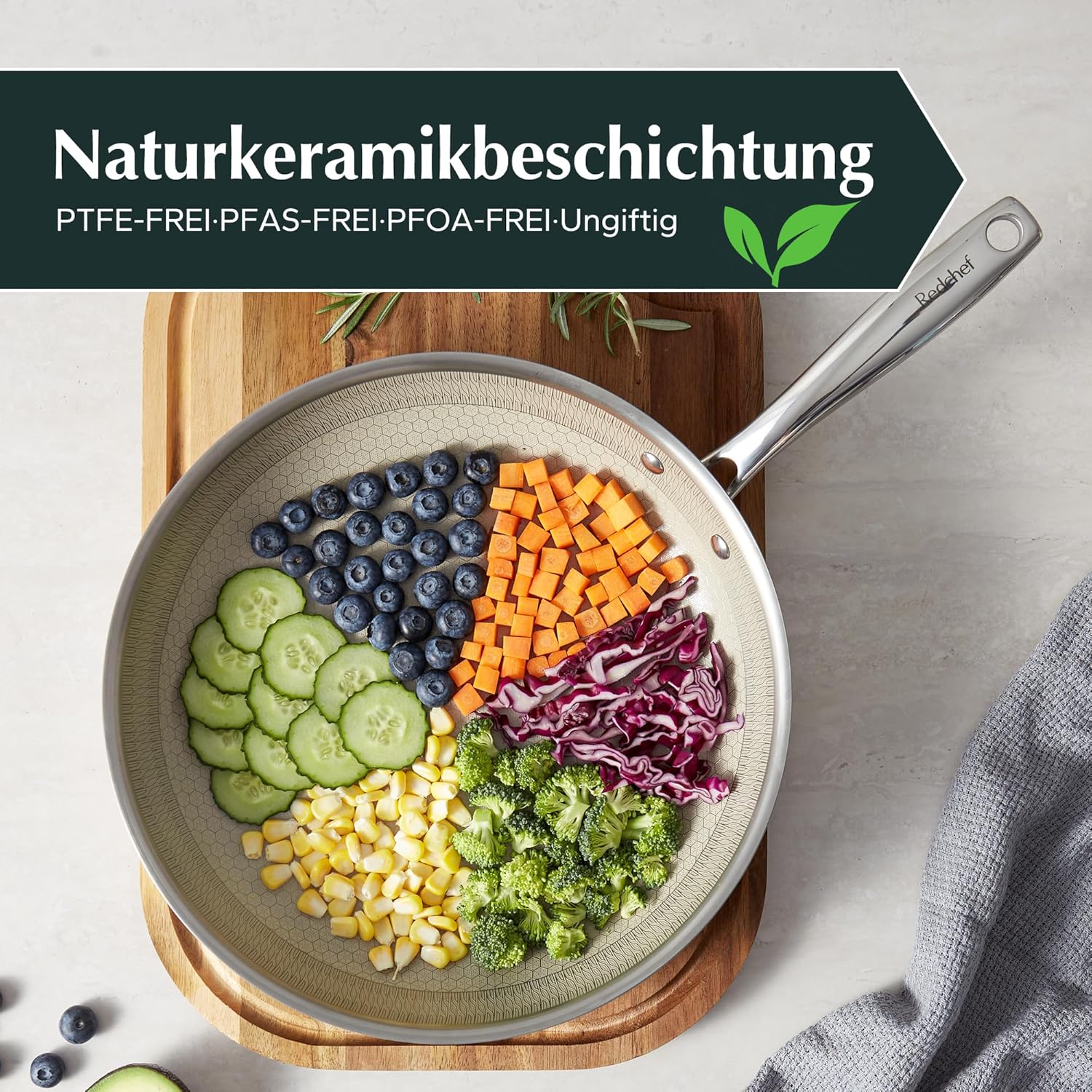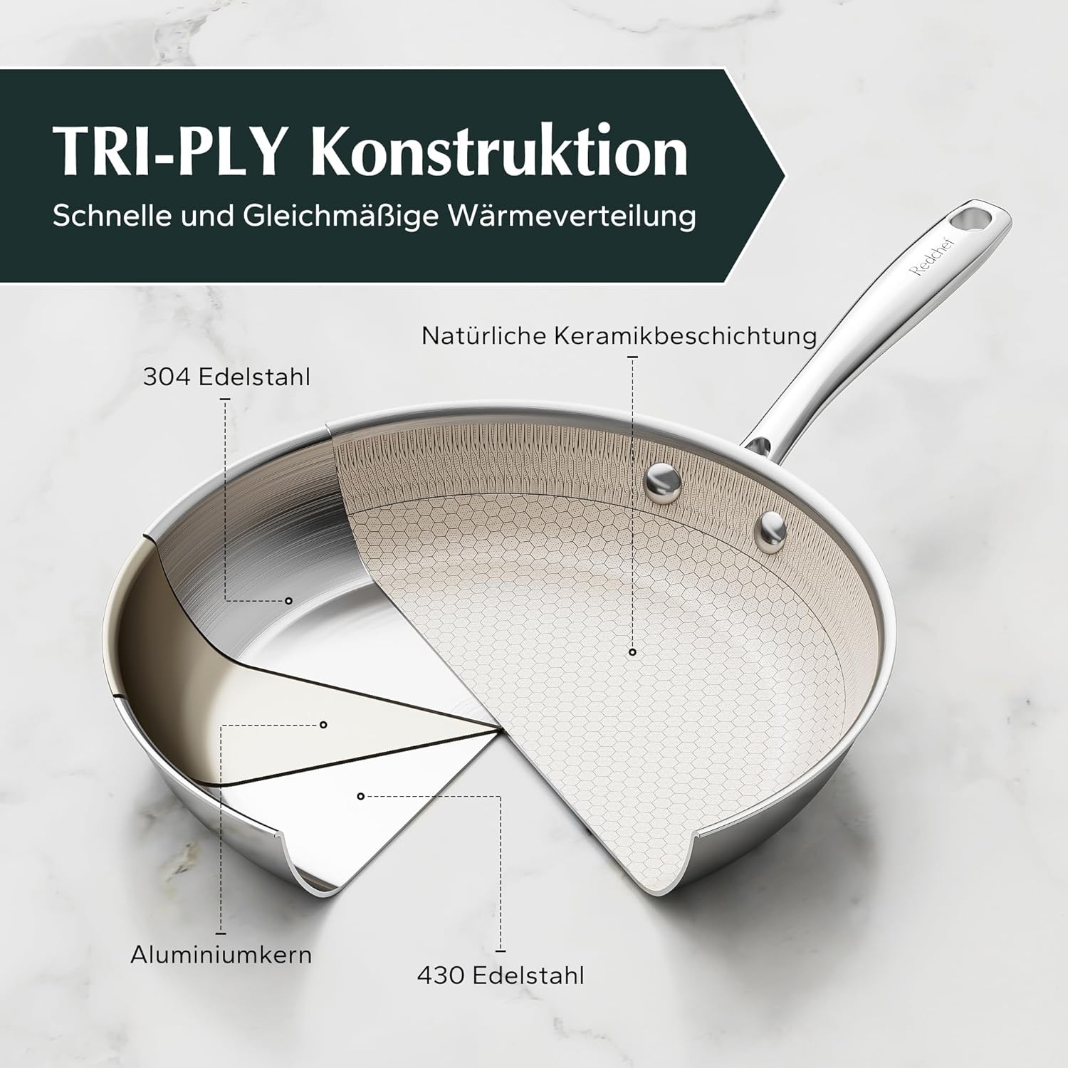 Honigwabenbeschichtung: Das einzigartige Wabenmuster sorgt für eine gleichmäßige Wärmeverteilung auf der gesamten Oberfläche Ihres Gerichts und verhindert heiße oder kalte Stellen beim Kochen. Diese innovative Beschichtung ist nicht nur antihaftbeschichtet, sondern auch frei von schädlichen Chemikalien, was unser Engagement für fortschrittliche Technologie unterstreicht. Dies spiegelt das Engagement von Redchef für fortschrittliche Technologie wider Kratzfest: Unsere Pfannen halten selbst den härtesten Stahlutensilien stand, ohne schnell zu verkratzen oder zu verschleißen. Hergestellt aus hochwertigem Edelstahl 304, bekannt für seine Langlebigkeit und Rostbeständigkeit, sind diese 28 cm Pfannen robust und widerstandsfähig gegen Verformung Kompatibel Mit Allen Öfen & Herdarten: Dieses Honigwaben-Kochgeschirr ist kompatibel mit allen Arten von Öfen; einschließlich Induktion; Gas; konventionell; Keramik und elektrisch. Es deckt eine Vielzahl von Kochbedürfnissen ab, wie z.B. das Braten von Eiern, Steaks, Pasta usw. Unsere multifunktionale Pfanne ermöglicht verschiedene Kochmethoden, um Ihre kulinarischen Fähigkeiten zu verbessern Robust & Stabil: Die Pfanne verwendet ein verbessertes dreischichtiges Stahlverfahren, wobei die äußere Schicht aus 430 lebensmittelechtem magnetischem Edelstahl, die mittlere Schicht aus einer Legierung mit hoher Wärmeleitfähigkeit aus Aluminium und die innere Schicht aus lebensmittelechtem 304 Stahl besteht. Im Inneren befindet sich eine Schicht aus einem Wabenkorrosionsmuster, und die Topfkörperkonstruktion ist integral geformt, was ihn widerstandsfähiger gegenüber Beanspruchungen macht Edelstahl-Kühle-Touch-Griffe: Der Edelstahl-Langgriff der Pfanne ist sicher mit Nieten verbunden und bietet Sicherheit, Stabilität und ausgezeichnete Unterstützung, während er während des Kochens kühl bleibt. Er ist langlebig und leicht zu reinigen, was während des Kochprozesses die Lebensmittelsicherheit und Hygiene gewährleistet. Der Griff schützt auch Ihre Hände vor Ölspritzern und verhindert, dass er überhitzt. Die Redchef Edelstahl-Wabenbeschichtung ist Ihre beste Wahl Ausgezeichnete Qualität & Service: Wir bei Redchef setzen Qualität über alles und halten an einem Engagement für außergewöhnlichen Service fest. Jede Redchef-Bratpfanne durchläuft strenge mehrfache Qualitätskontrollen | قیمت یورویی : 49.99€