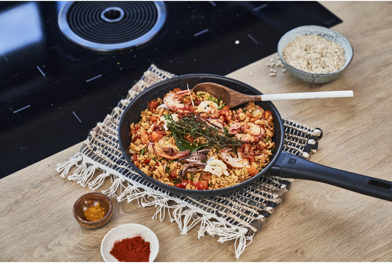 ماهیتابه لبه بلند zwilling سری Marquina Plus با قطر 26 سانت، ساختهشده از آلومینیوم فشرده با روکش نچسب مقاوم، گزینهای عالی برای پخت سالم و کمچرب غذاها با توزیع یکنواخت حرارت.