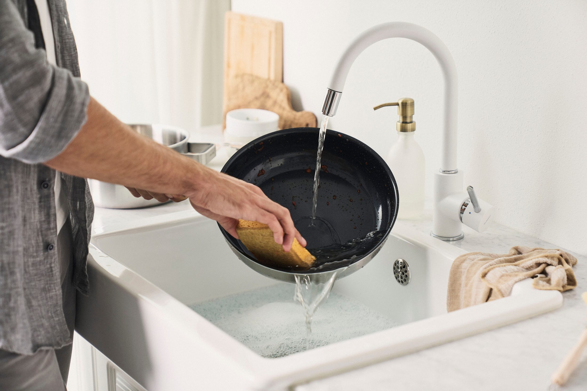 ماهیتابه zwilling سری Pure با طراحی مینیمال و رنگ سفید عاجی، ترکیبی از زیبایی و عملکرد را در آشپزخانه شما به ارمغان میآورد. این محصول از آلومینیوم با روکش نچسب مقاوم ساخته شده که به توزیع یکنواخت گرما کمک کرده و باعث پخت بهتر غذاها میشود.