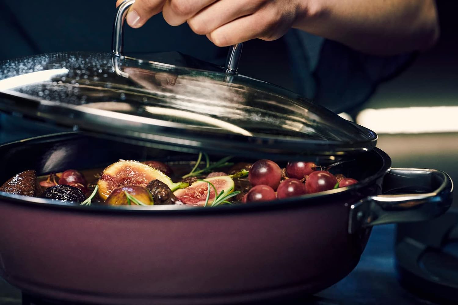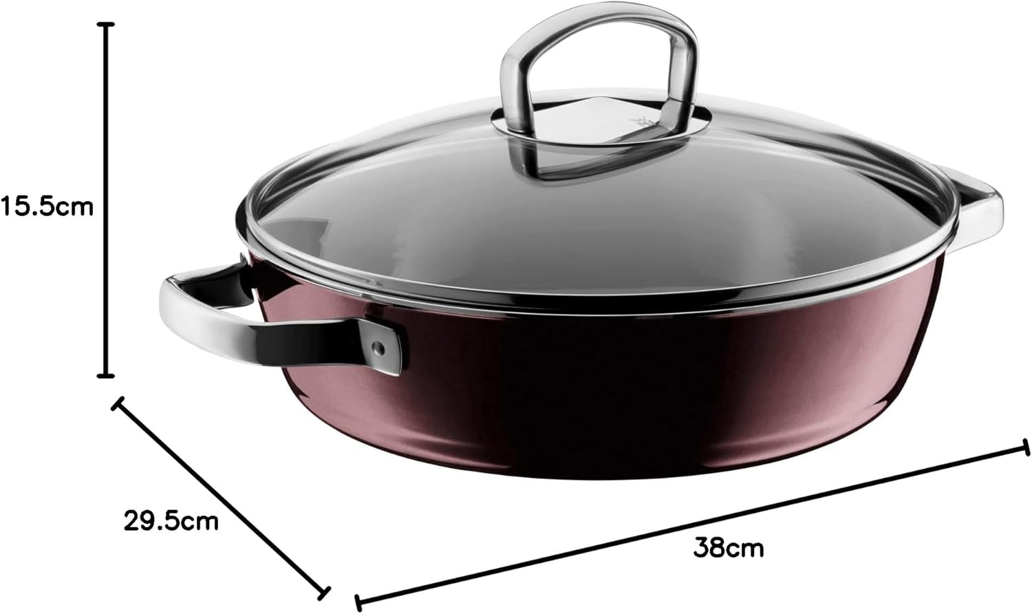ماهیتابه کبابپزی معدنی WMF Fusiontec، 28 سانتیمتر سازگار با القایی، ماهیتابه با درب شیشهای، قابلمه کبابپزی 4.1 لیتری، لبه بلند، سرامیک پیشرفته، مقاوم در برابر خش، قرمز تیره