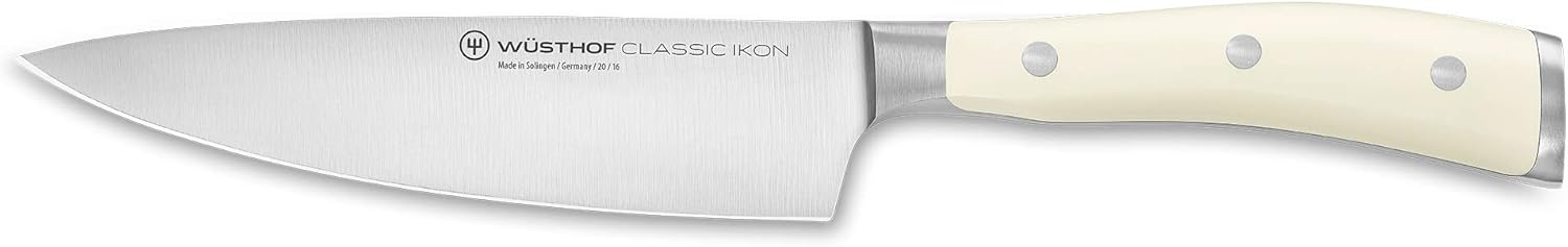 Mit den cremeweißen Griffen sind Wüsthof Messer der Classic Ikon Crème Serie ein eleganter Eyecatcher in der Küche. Dabei sorgt die anspruchsvolle Solinger Qualität bei der Anwendung für einen weiteren Wow-Effekt – scharfe Kochmesser, zeitloses Design Das etwas kürzere Universalmesser (ultrascharfe Klinge, 16 cm) ist ein Allzweckmesser für feine Schnitte an kleineren Lebensmitteln. Es eignet sich zum Schneiden, Hacken, Wiegen und Transportieren von Fisch, Fleisch, Gemüse, Salat, Kräuter oder Obst Das ideal ausbalancierte Profi Kochmesser aus rostfreiem Stahl wird im speziellen Schärfverfahren geschliffen, bevor die Messerklinge per Hand den finalen Polierabzug erhält und somit ihre beeindruckende Schärfe – für langlebige Präzision Durch die kleine Wölbung im vorderen Bereich liegt der ergonomische Griff besonders angenehm und sicher in der Hand. Die hellen, rutschfeste Griffschalen sorgen für einwandfreie Hygiene und sehen auch in einer Design-Küche richtig gut aus Wüsthof Classic Ikon Creme ist das Lieblings-Küchenzubehör der stilbewussten Köchin, die Chefmesser beeindrucken zudem als offizielles Werkzeug der deutschen Nationalmannschaft der Köche. Qualitätsmesser – Made in Germany, geschmiedet in Solingen | قیمت یورویی : 125.01€