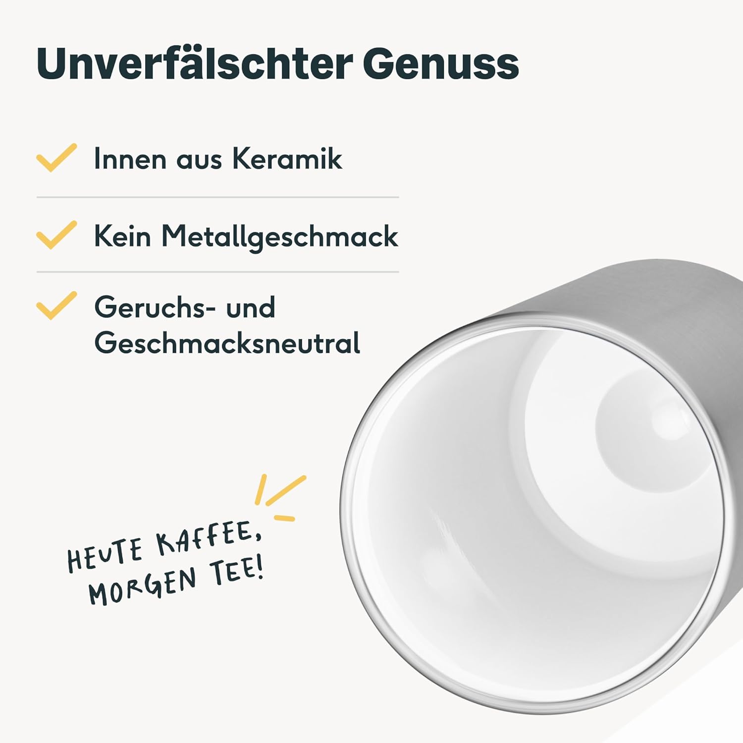 Purer Genuss - Die feine Keramik im Inneren ist neutral im Geschmack und absorbiert keine Aromen. So genießt du authentischen Geschmack von Kaffee und Tee erst richtig. Kein Nachgeschmack von Plastik oder Metall mehr. 100% Auslaufsicher - Dank patentiertem Schlussmechanismus ist der BPA-freie Deckel mit rostfreiem Edelstahl-Top in jeder Lage auslaufsicher. Mit dem 1-Klick-Mechanismus kann der Becher einhändig genutzt werden. 12h kalt & 6h warm - Ideal für Kaffee, Tee, aber auch Kaltgetränke. Die Thermotasse ist doppelwandig vakuumisoliert und besitzt eine zusätzliche Kupferschicht, die die Temperatur noch besser bewahrt. Dabei bleibt die Außenseite kühl. Schlank & viel Kapazität - Mit seinem Gewicht (275g) ist der Becher super leicht und dank der schlanken Form passt er in jeden Getränkehalter. Ideal zum Wandern, in die Schule, ins Büro, im Auto oder unterwegs in der Bahn. Einfach sauber - Der Becher wurde mit einer Schutzschicht ummantelt, um widerstandsfähiger zu sein gegen Fingerabdrücke und Kratzer. Der Deckel ist komplett demontierbar. | قیمت یورویی : 19.95€