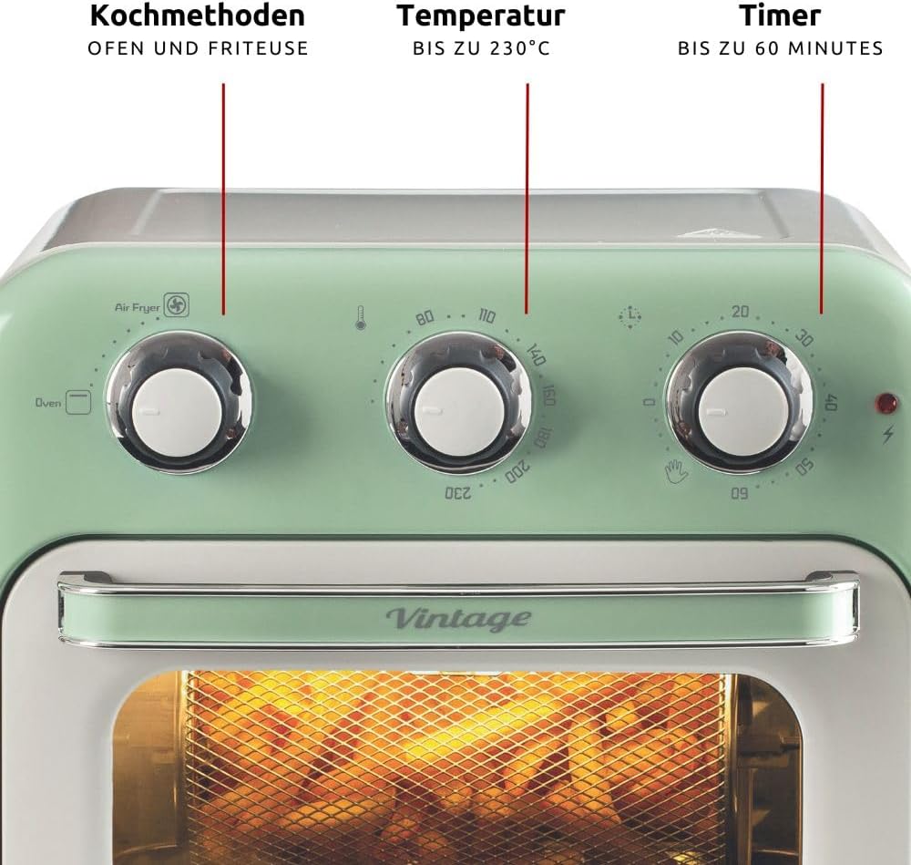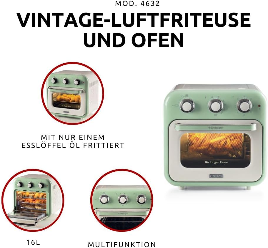 مدل Vintage از برند آریته، با طراحی الهام گرفته از دهه ۵۰ میلادی و تکنولوژی مدرن، امکان پخت غذاهای ترد و سالم را بدون استفاده از روغن فراهم میکند. با توان 1300 وات و ظرفیت 2.9 لیتری، این ایر فرایر برای خانوادههای کوچک و متوسط ایده آل است. کنترل دستی دما و زمان پخت، کاربری آسان و نتایج دلخواه را ممکن میسازد. رنگ سبز خاص دستگاه، آن را به گزینهای زیبا برای دکور آشپزخانههای مدرن یا کلاسیک تبدیل کرده است.