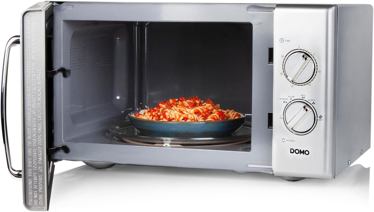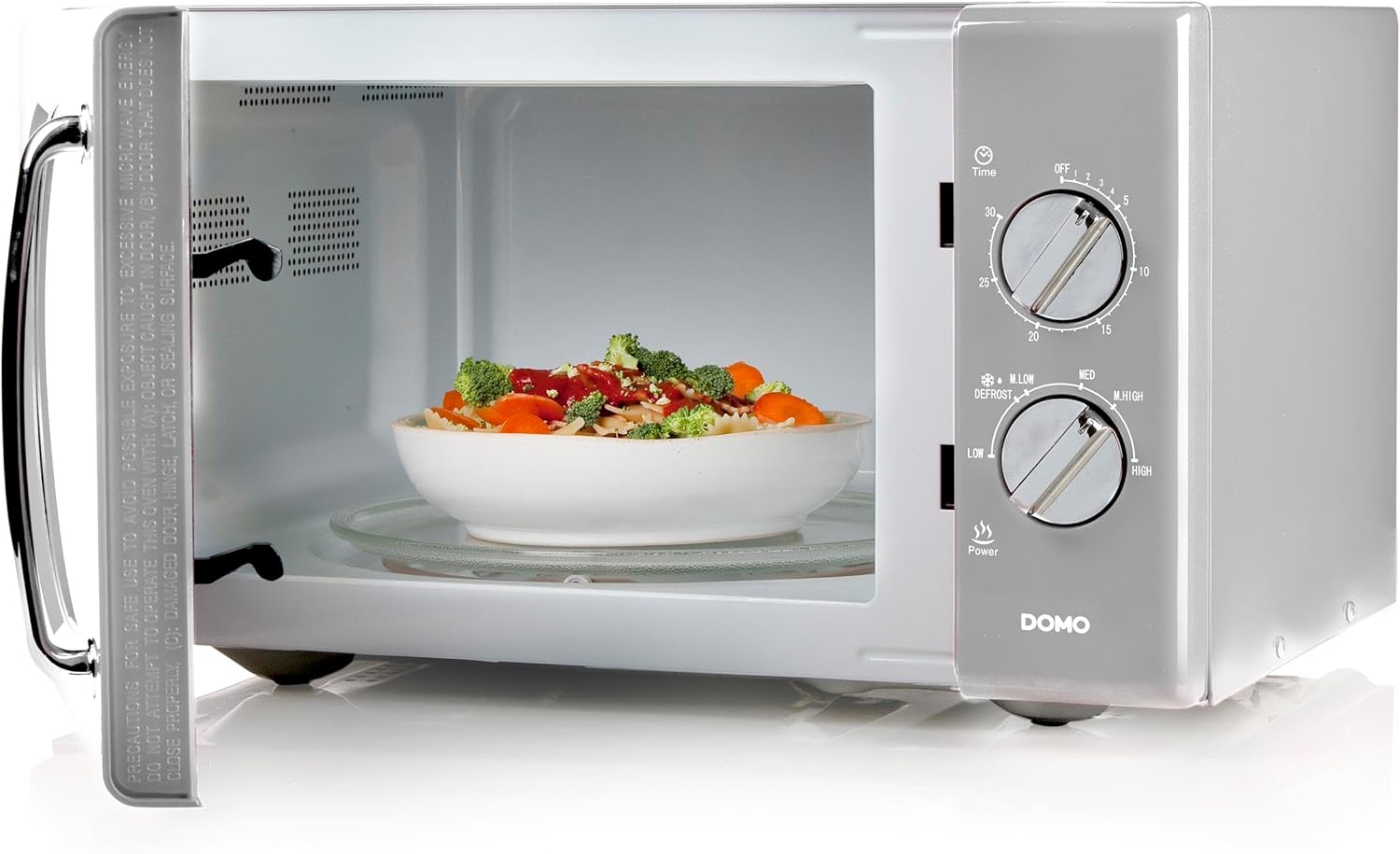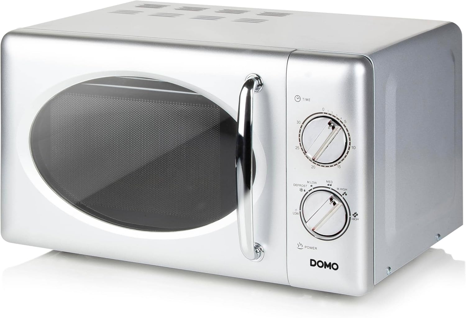 DOMO DO3025 Freistehend Retro Mikrowelle - 6 Leistungsstufen - Mechanische Bedienung - Mit Timer bis 30 Minuten - Auftaufunktion - 25 Liter - 900 Watt - Silber/Grau Silver | قیمت یورویی 121.53€