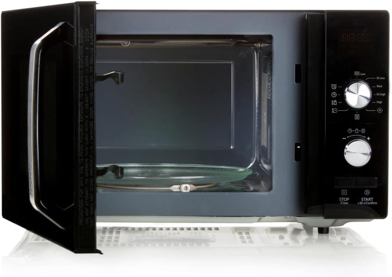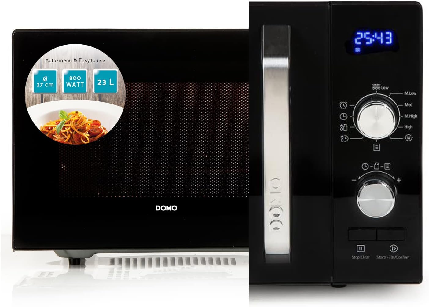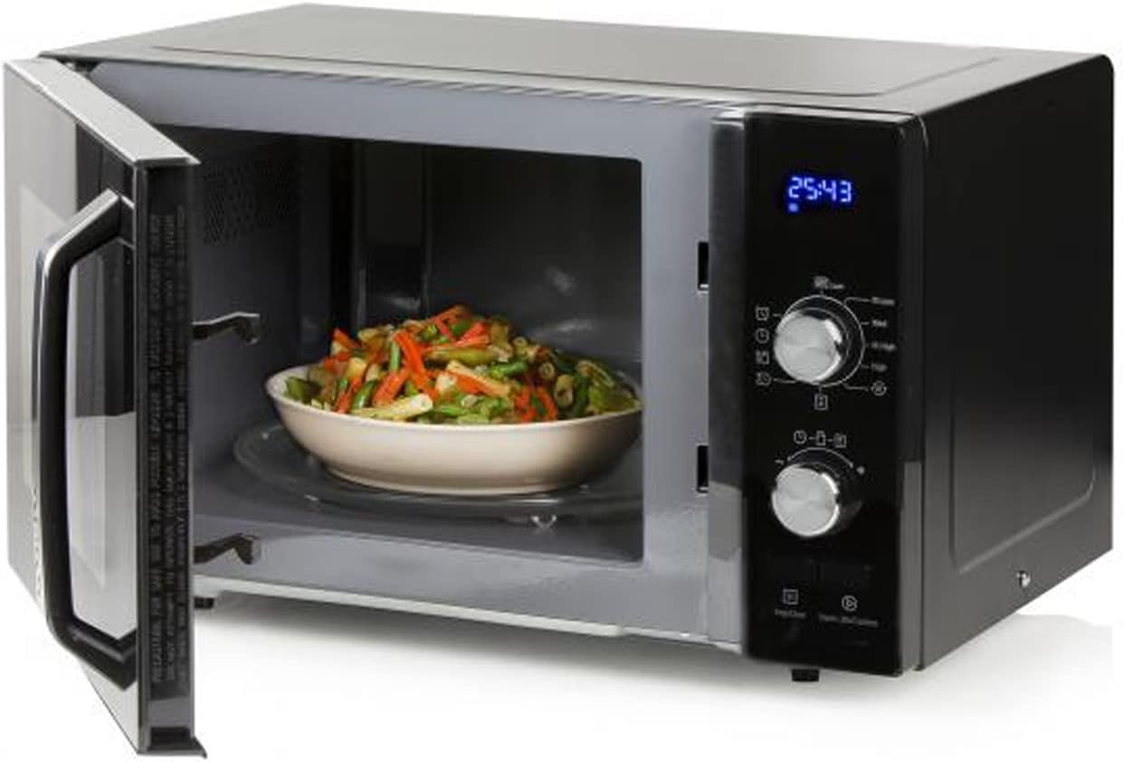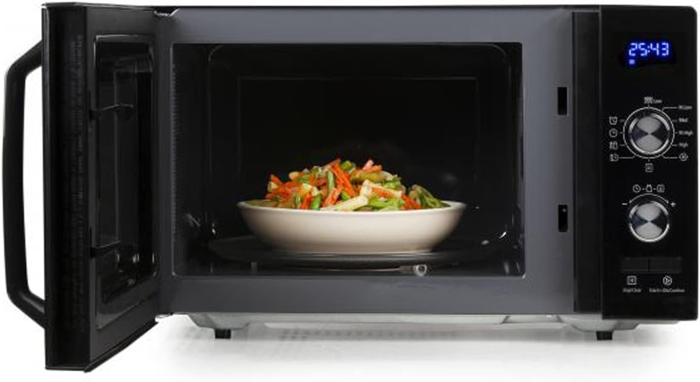 Mikrowelle in Schwarz mit edlem Griff in Silber - mit Auftaufunktion 23 Liter Volumen - mechanisch bedienbar Das Solo-Kompakt-Mikrowellengerät mit mechanischer Bedienung eignet sich ideal zum Kochen, Auftauen, Garen & Erwärmen von Speisen Mit einem Fassungsvermögen von 23 Litern und 800 Watt Leistung können Sie ganz einfach und schnell Speisen für mehrere Personen zubereiten Die 8 Kochprogramme & 5 Leistungsstufen über zwei Drehregler erlauben zusammen mit der Timer-Funktion eine punktgenaue Zubereitung aller Speisen Inklusive 1 x Abdeckhaube Ø26cm mit Griffmulden - Spülmaschinen geeignet Geruchs- sowie Geschmacksneutral & Temperatur beständig von -40°C bis +110°C | قیمت یورویی : 133.99€