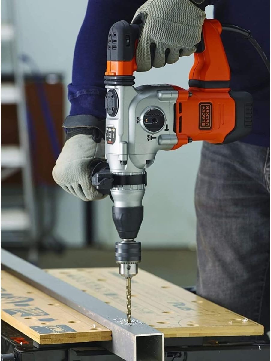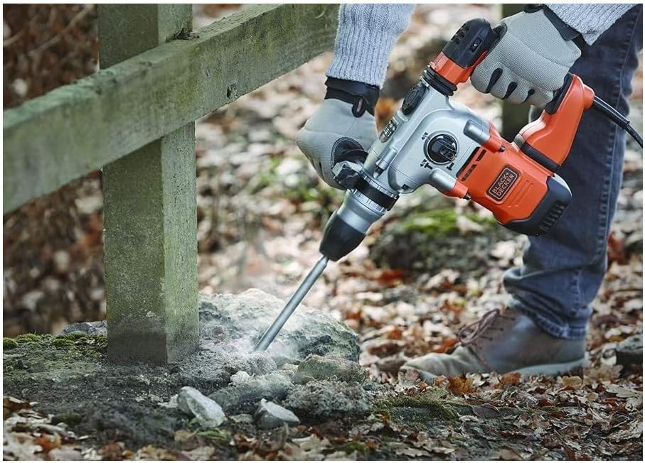 BLACK+DECKER SDS+ Bohrhammer, 1250-W-Motor, 3-Modus-Funktionalität, 3,5-J-Schlagkraft, einschließlich Bohrer & Meißel, BEHS03K-QS لینک آمازون : https://www.amazon.de/dp/B0857R3HZ6?th=1&psc=1 عملکرد قدرتمند: موتور 1250 وات با نیروی ضربه 3.5 ژول و 4100 ضربه در دقیقه برای حفاری و اسکنه کاری موثر عملکرد همه کاره: 3 حالت - حفاری، حفاری چکشی و حفاری - طیف وسیعی از کارهای DIY و ساخت و ساز را پوشش می دهد. طراحی ارگونومیک: دسته با انگشت شست و شاخص طبیعی برای اعمال فشار و کنترل بهتر راحتی کاربر: شامل یک ماشه دو انگشتی و یک دکمه قفل برای افزایش راحتی در طول استفاده طولانی مدت طراحی شده برای ماندگاری: دارای یک کیف محافظ ناهموار برای مقاومت در برابر کارهای سنگین محدوده تحویل: دارای دسته جانبی، توقف عمق، دو مته بتن SDS+ (6 میلی متر و 8 میلی متر) و یک اسکنه مسطح 25 میلی متری