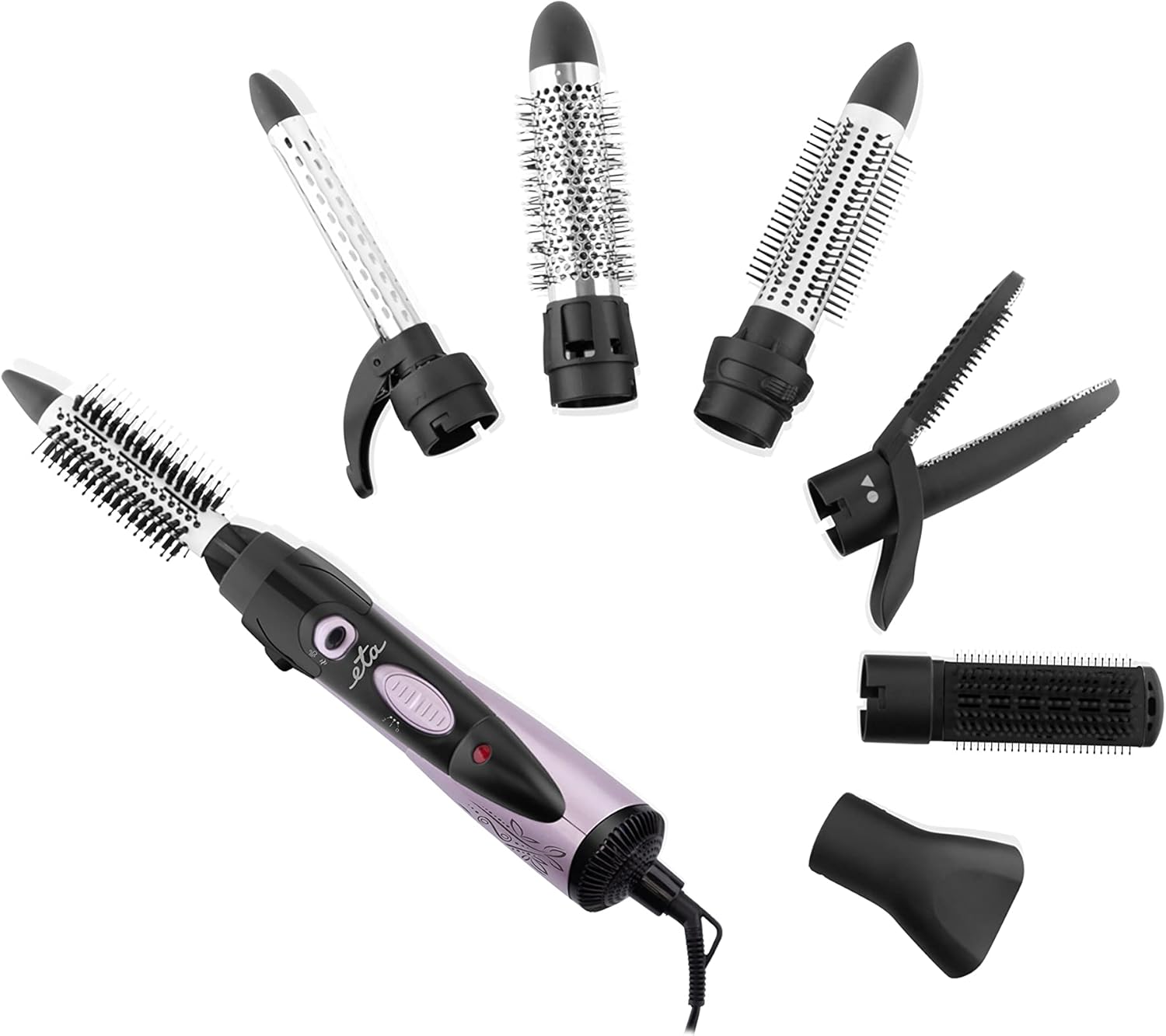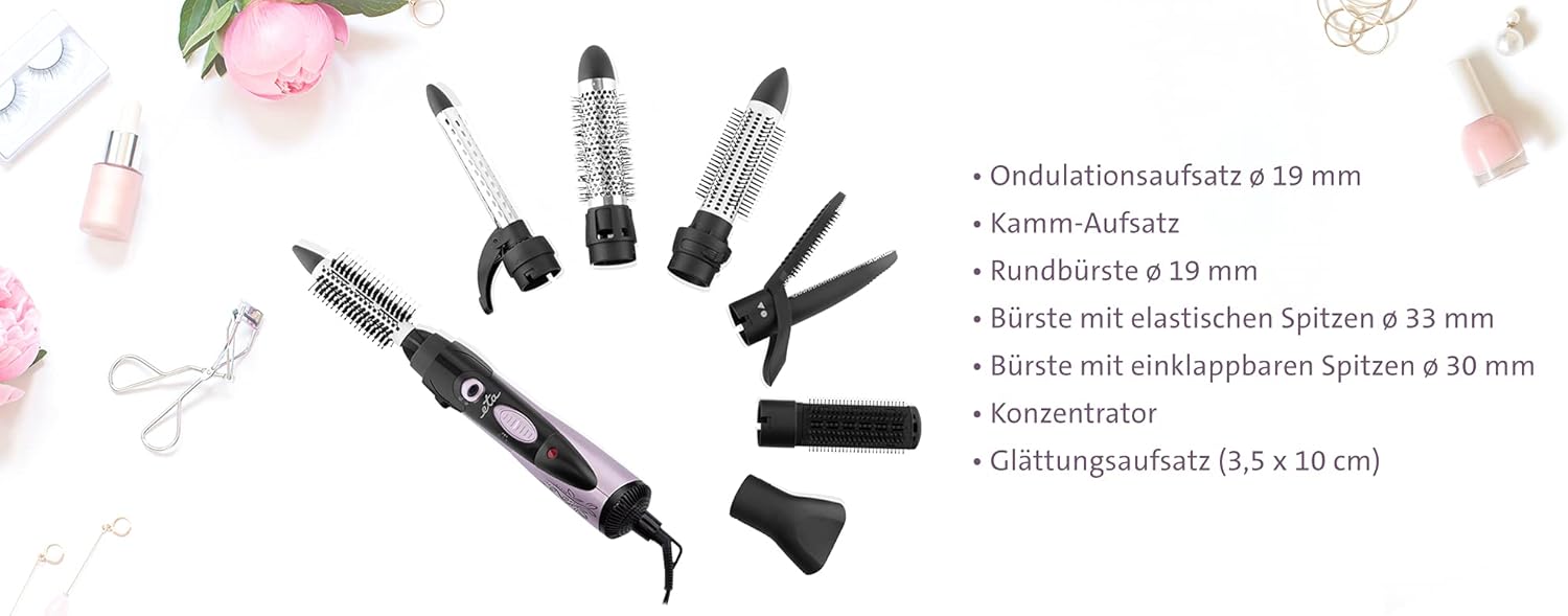 Der Lockenstab Set Rosalia bietet alles, was Sie für ein einfaches Hairstyling benötigen. Er verfügt über einen leistungsstarken 1.000 W Motor, der schnelles Trocknen und Styling mit großartigen Ergebnissen ermöglicht. Der Heißluft-Lockenstab ist mit 7 austauschbaren Aufsätzen ausgestattet. Die Ionisierungsfunktion sorgt für glattes und glänzendes Haar. Die Kaltlufttaste ermöglicht eine sofortige Fixierung der Frisur. Es stehen 2 Temperatureinstellungen und 2 Gebläsegeschwindigkeiten zur Verfügung. Einfache Bedienung und einfacher Austausch des Zubehörs. | قیمت یورویی : 29.99€