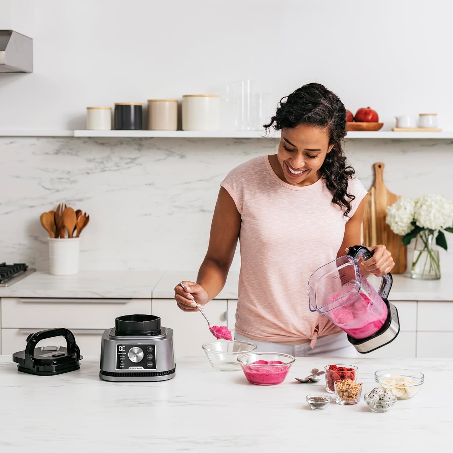 مخلوط کن اسموتی ساز سه کاره Ninja Foodi Power Nutri، مناسب برای انواع نوشیدنیهای غلیظ و یخ زده، برنامههای خودکار، پارچ ۲.۱ لیتری، فنجان ۷۰۰ میلیلیتری و کاسه ۴۰۰ میلیلیتری با همزن برقی، ۱۲۰۰ وات، مخلوط کن نقرهای CB350EU، ۳ کاره، ۱۲۰۰ وات