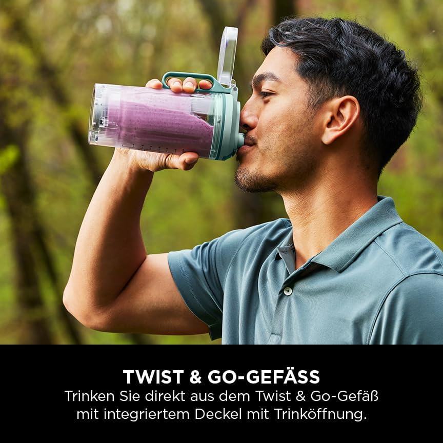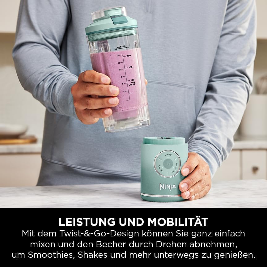 DER LEISTUNGSSTÄRKSTE KABELLOSE MIXER VON NINJA: Mit einem stärkeren Motor als der ursprüngliche Ninja Blast zerkleinert der Blast Max Eis und gefrorene Zutaten in Sekundenschnelle 3 MIXFUNKTIONEN: Einfach zu bedienende One-Touch-Mixmodi wie Crush und Smoothie sowie manueller Mixmodus 570ML MIXBECHER: Mit dem Twist-and-Go-Design können Sie den Becher nach dem Mixen herausnehmen und Smoothies, Shakes und mehr unterwegs genießen. Inklusive auslaufsicherem Deckel, Tragegriff und Trinköffnung (*490 ml maximales Fassungsvermögen) LANGLEBIGER, WIEDERAUFLADBARER AKKU: Mixen Sie bis zu 25-mal mit einer vollen Ladung – auch unterwegs INHALT: Blast Max Motorbasis, Mixbecher mit integrierten Klingen, auslaufsicherer Trinkdeckel, Ladekabel & Rezeptanleitung. H: 30 cm x B: 9 cm x T: 11,5 cm. Gewicht: 1,3 kg. Farbe: Meerglas | قیمت یورویی : 74.99€