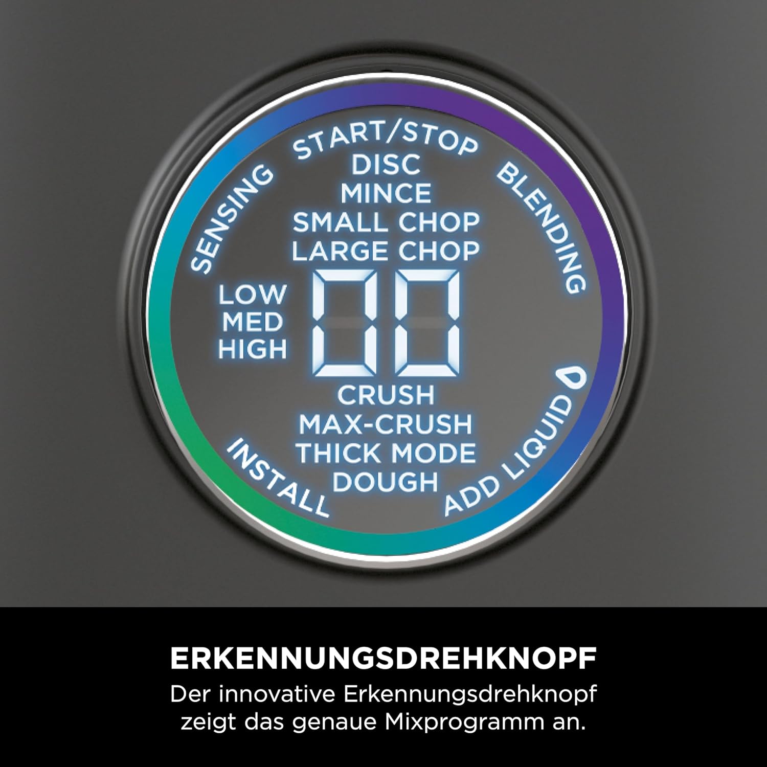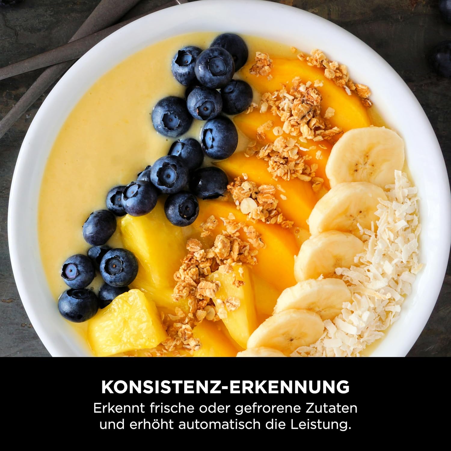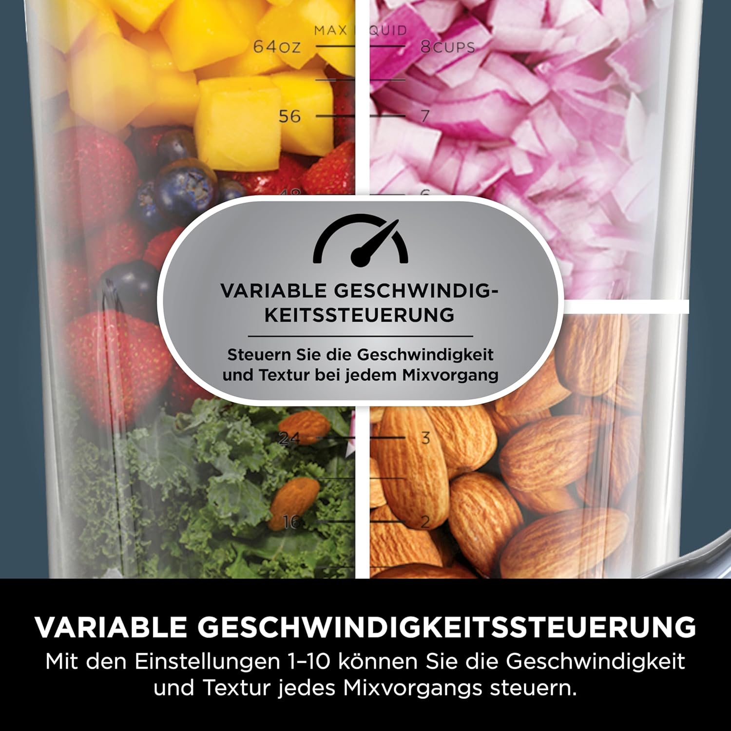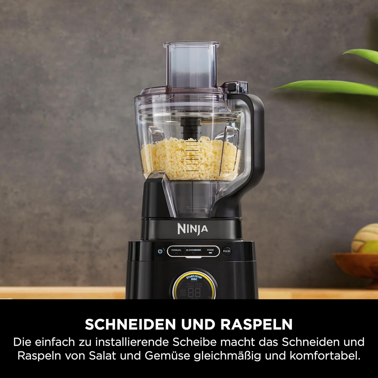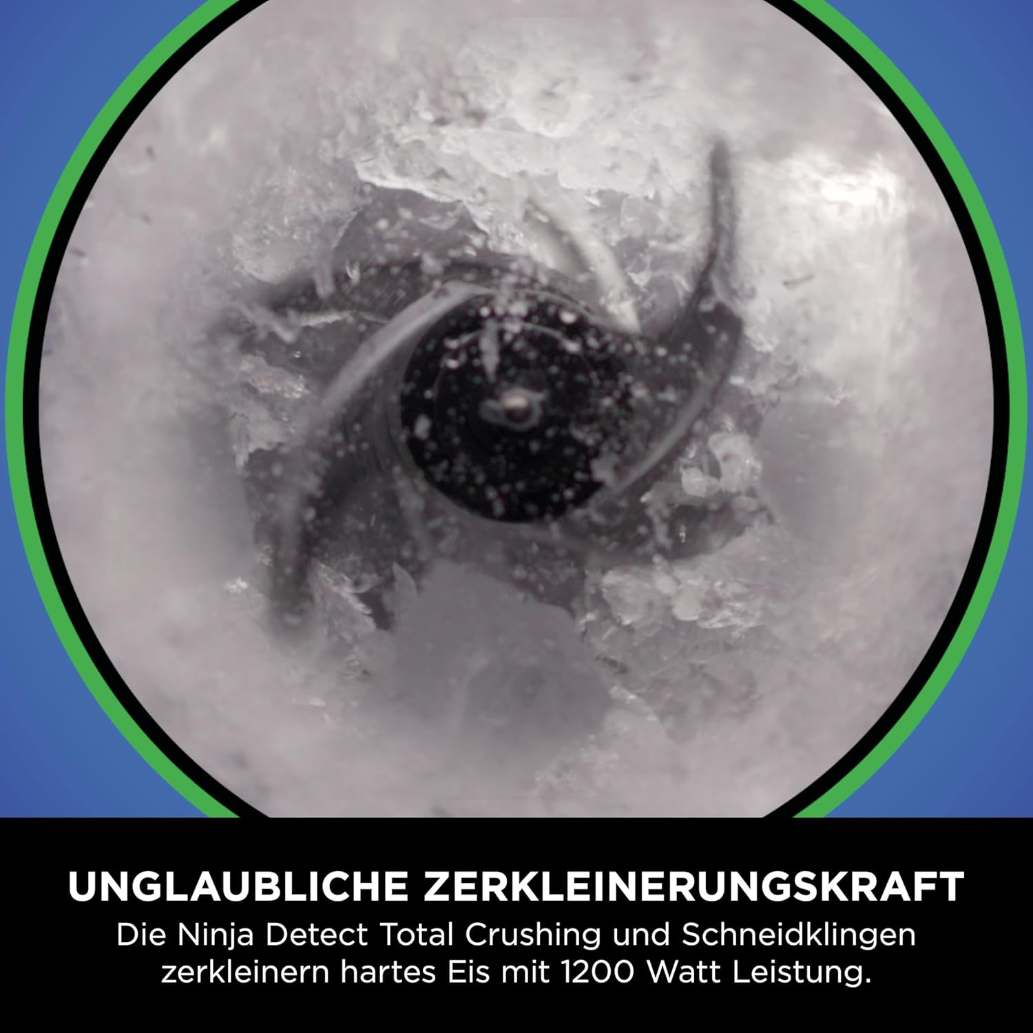BLENDSENSE-TECHNOLOGIE: Erkennt die Zutaten, die Portionsgröße und das Eis und passt dann automatisch die Geschwindigkeit, die Zeit und den Puls für ein perfektes Ergebnis an 3 GERÄTE IN 1: Platzsparender Krugmixer, Küchenmaschine und persönlicher Mixer. Bereiten Sie Eiskaffee für Ihren Weg zur Arbeit im Einzelportionbecher zu. Kneten Sie Teig in der Verarbeitungsschüssel oder mixen Sie Cocktails im großen Krug DETECT DIAL: Mit dem leicht lesbaren Drehknopf haben Sie die volle Kontrolle über Mixen, Zerkleinern & mehr. 20 Funktionen zur Auswahl (14 manuelle und 6 automatische Modi). Inklusive Countdown-Timer & "Flüssigkeit hinzufügen"-Benachrichtigung AUTO, MANUELL & VOREINGESTELLTE MODI: Mit den Ninja Detect Mixern haben Sie so viel oder so wenig Kontrolle in der Küche, wie Sie möchten. Genießen Sie die automatische BlendSense-Technologie, 10 Geschwindigkeiten und praktische voreingestellte Modi. Inklusive Rezeptführer ENTHÄLT: Ninja Blender & Food Processor, 1200W Motorbasis, 2L Krug mit Deckel (mit 1,9L maximale Flüssigkeitskapazität), 1.8 Schüssel (Maximale Füllmenge: 1,6L Kapazität), 1x 680ml Einzelportion-Becher (mit 644 ml maximale Flüssigkeitskapazität), Total Crushing & Schneidklinge, Hackmesser, Knethaken, Schneide-/Zerkleinerungsmesser, Hybrid Edge Blades & Rezeptheft ABMESSUNGEN: H: 44,5 cm x B: 21 cm x T: 17,5 cm. Gewicht: 6,3 kg. Farbe: Schwarz | قیمت یورویی : 189.99€