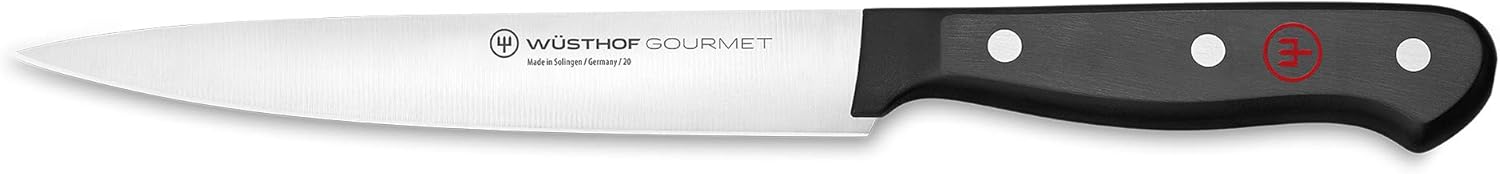 Mit Gourmet hat Wüsthof Messer Basics im Angebot, die als scharfe Kochmesser nicht nur durch richtig gute Qualität und einen günstigen Preis begeistern, sondern als zuverlässige Solinger Messer – so wie dieses Universalmesser zum Filetieren Feines Spezialmesser für filigrane Schnitte – die biegsame Klinge kann ideal an kleinen Knochen, Gräten oder Haut entlanggeführt werden und eignet sich als Fleischmesser, Fischmesser zum hauchdünnen Schneiden – auch als Obstmesser für Fruchtfleisch-Filets Scharf und stabil – die ausgelaserte Messerklinge wird in 35 Arbeitsgängen so verarbeitet, dass sie durch eine Härte von 56° Rockwell und der Verlängerung unter dem Griff mit der Stabilität und Schärfe geschmiedeter Profi Küchenmesser vergleichbar ist Agil und spülmaschinengeeignet – der ergonomische Griff ist 3-fach vernietet und absolut pflegeleicht. Dank des geringen Gewichts ermöglicht das scharfe Fleischmesser (Profi Fleischmesser) präzises, schwungvolles Schneiden – also viel Spaß in der Küche Wüsthof Gourmet überzeugt durch ein sehr gutes Preis-Leistungsverhältnis und ist als Starterset für den Privat-Haushalt ebenso interessant wie als Grundausstattung für die Gastronomie (Profiküche). Küchen Messer – Made in Germany, hergestellt in Solingen | قیمت یورویی : 49.9€