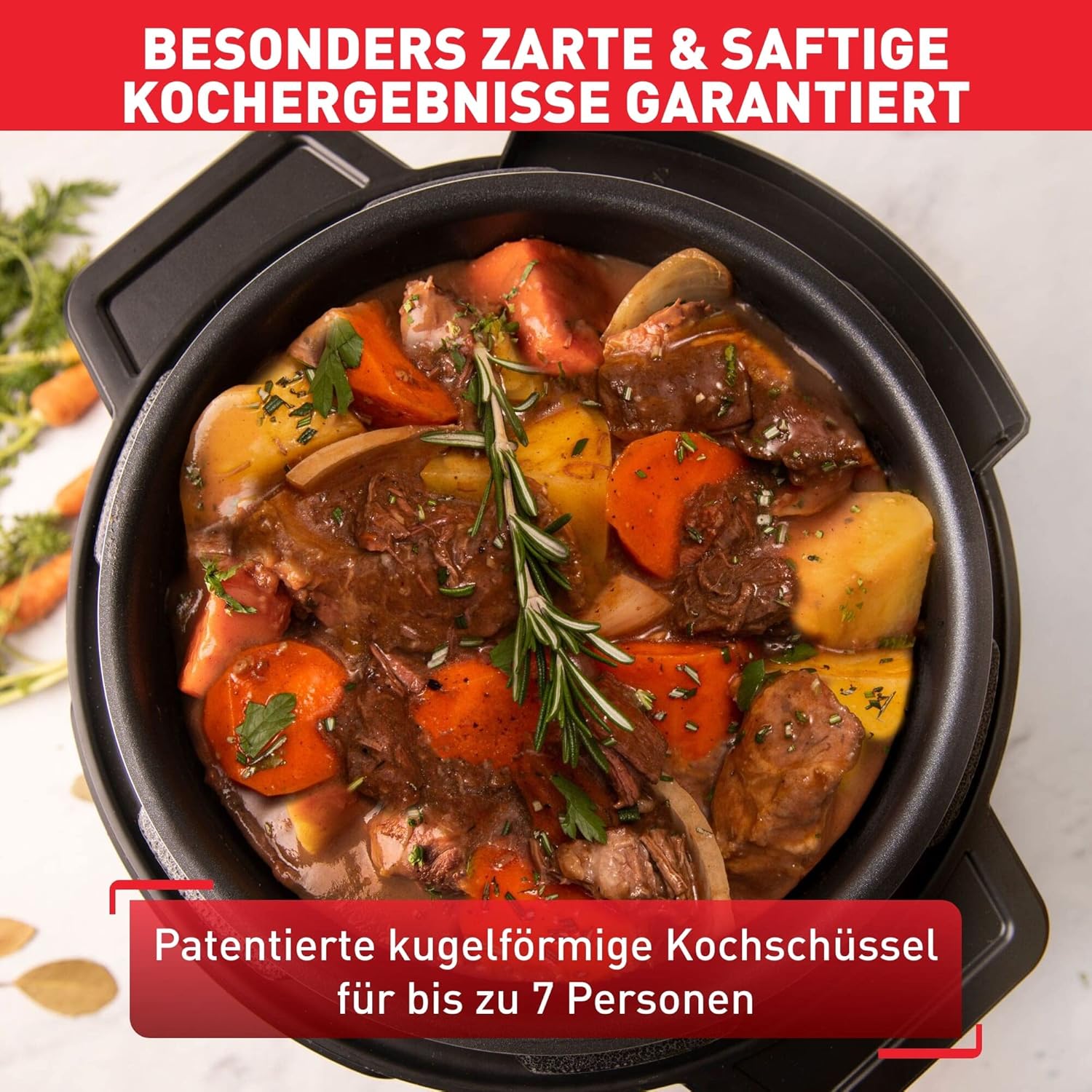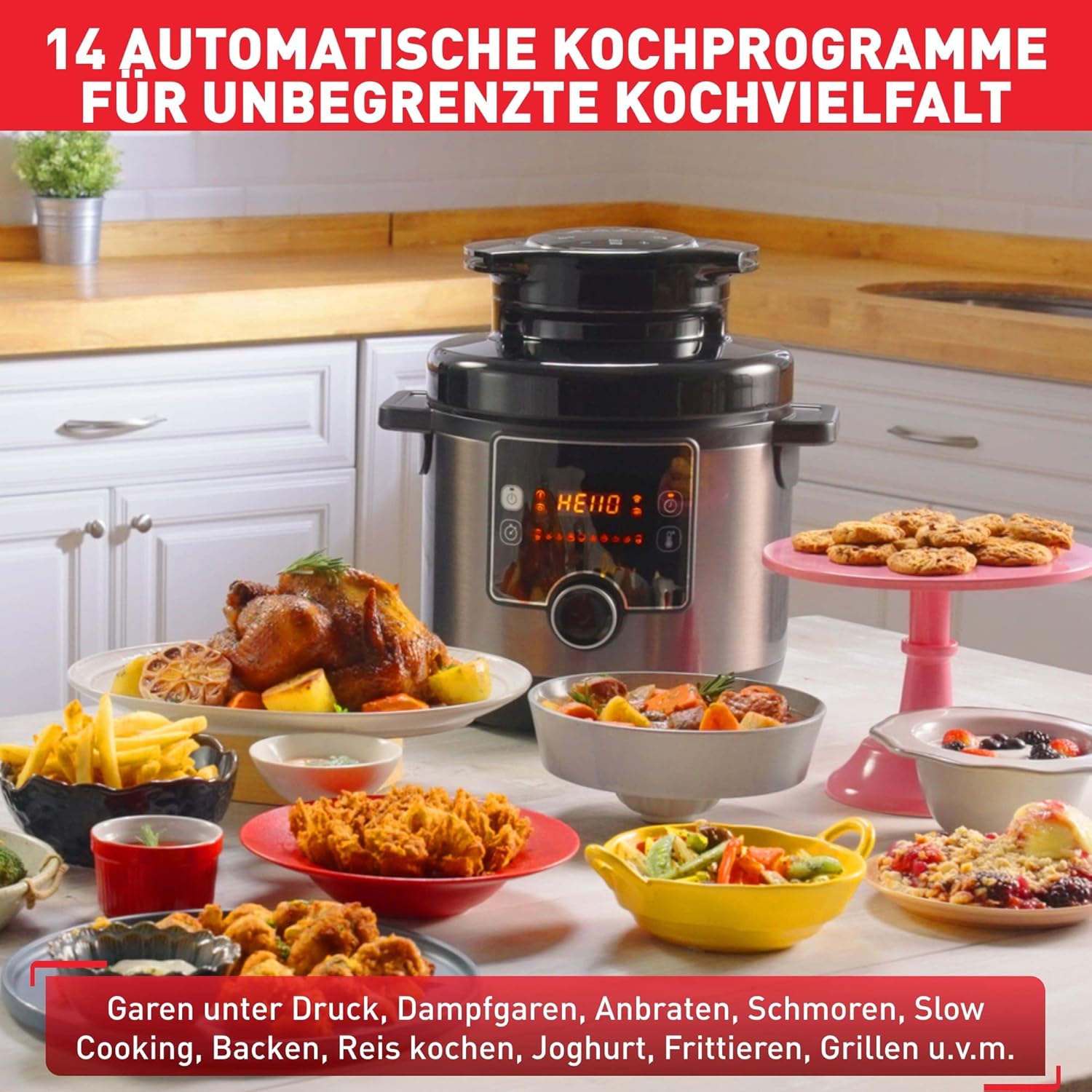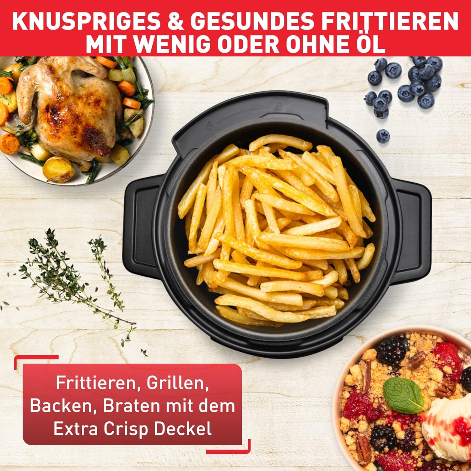 Unbegrenzte Möglichkeiten: Ein vielseitiger Multikocher mit Schnellkochfunktion, der sich dank zusätzlichem Extra Crisp Deckel im Handumdrehen auch in eine Heißluftfritteuse verwandeln lässt; intuitive Bedienung: Ein einziger Drehknopf zum intuitiven Auswählen der Kochprogramme, Einstellen von Temperatur und Zeit oder zum Einstellen einer Startverzögerung sowie der Touch-Bedienung auf dem Frittierdeckel Köstliche Ergebnisse: Die patentierte Technologie der kugelförmigen Kochschüssel bietet eine größere Heizfläche mit optimaler Wärmeverteilung und -zirkulation für besonders zarte und saftige Ergebnisse; extra knusprig, aber gesund: Genießen Sie goldene und knusprige Ergebnisse auf gesunde Weise mit wenig oder gar keinem zusätzlichen Öl dank der Extra Crisp Air-Fry-Technologie 10 automatische Kochprogramme Plus 4 automatische Programme des Extra Crisp: Dampfgaren, Anbraten, Schmoren, Sous-vide and Slow Cooking, Reis, Porridge, Joghurt and Fermentieren, Suppen, Backen und individuell einstellbarer Kochmodus Plus Frittieren, Grillen, Backen, Braten mit dem Extra Crisp Deckel Schnelles Kochen ohne vor dem Herd zu stehen: Die Schnellkochfunktion (Garen unter Druck: 70 Kpa = 114°C) liefert perfekte Ergebnisse bis zu 3x schneller (im Vergleich zu herkömmlichem Kochgeschirr auf einem Gasoder Elektroherd; Aufwärmphase nicht eingeschlossen); genießen Sie einfaches automatisches Kochen, dass keine Überwachung des Kochvorgangs vor dem Herd erfordert Voller Komfort und Sicherheit: Mit der Dampffunktionstaste können Sie mit einem Klick den Druck ablassen, ohne mit dem Dampf in Berührung zu kommen keine Verbrennungsgefahr; inkl. Zubehör: Extra Crisp Deckel, Dampfgar-/Frittiereinsatz, Messbecher, Reislöffel, Rezeptheft; einfache Reinigung: Antihaftbeschichteter Kochbehälter und alle abnehmbaren Teile (außer der Extra Crisp Deckel) sind spülmaschinengeeignet | قیمت یورویی : 279.99€