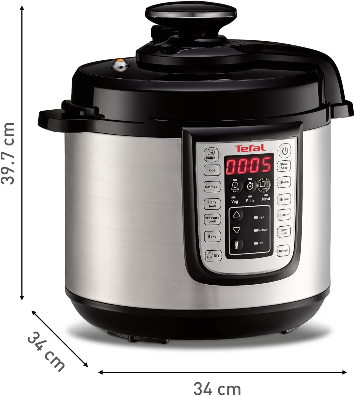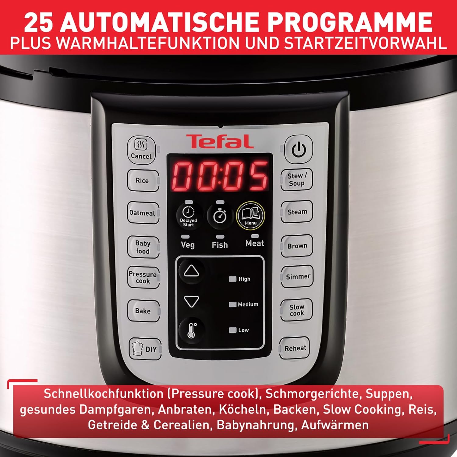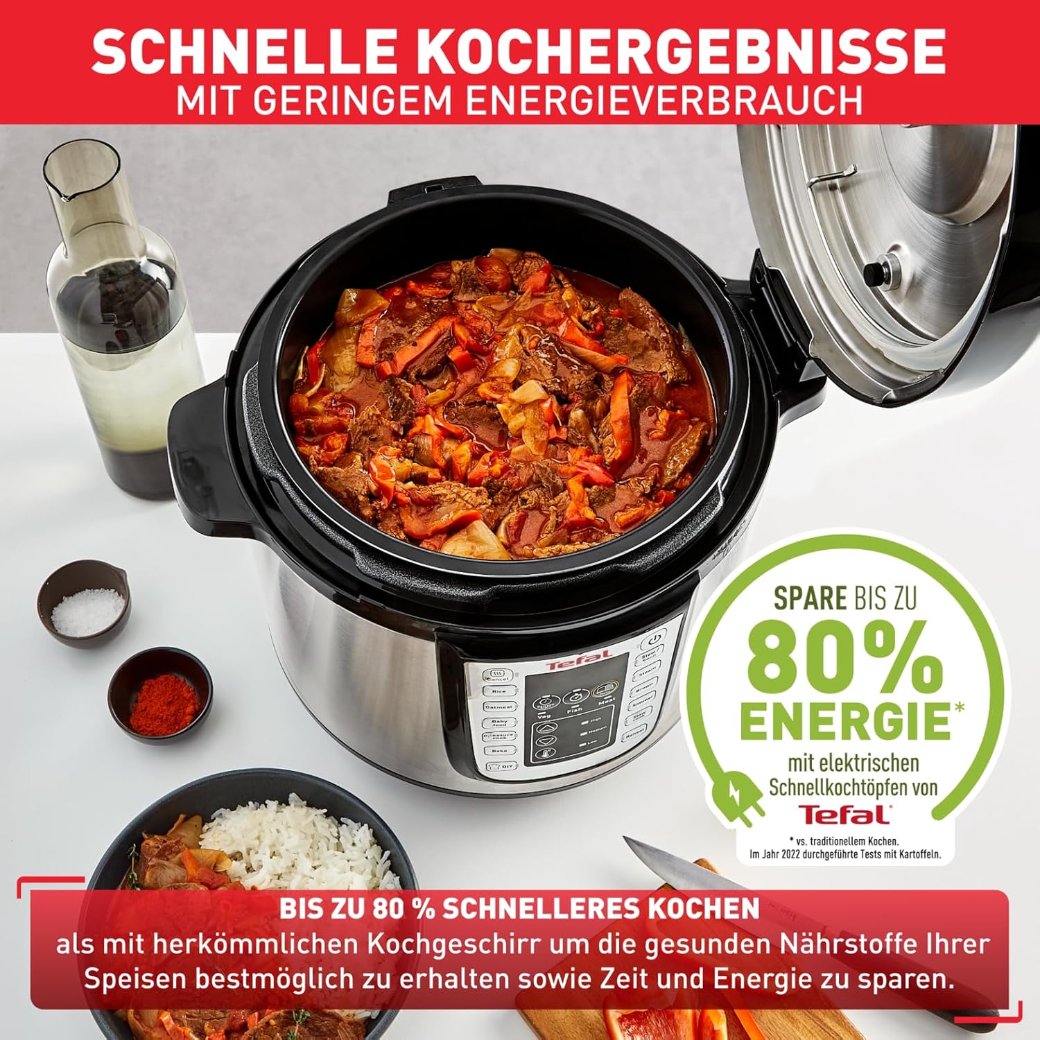 Tefal CY505E Fast & Delicious Multikocher | elektrischer Schnellkochtopf | 6 L Kapazität | 25 Automatische Programme | Bis zu 80 % schnelleres Kochen | Energiesparend | Rezeptheft | 1200 W | Edelstahl | قیمت یورویی 106.99€