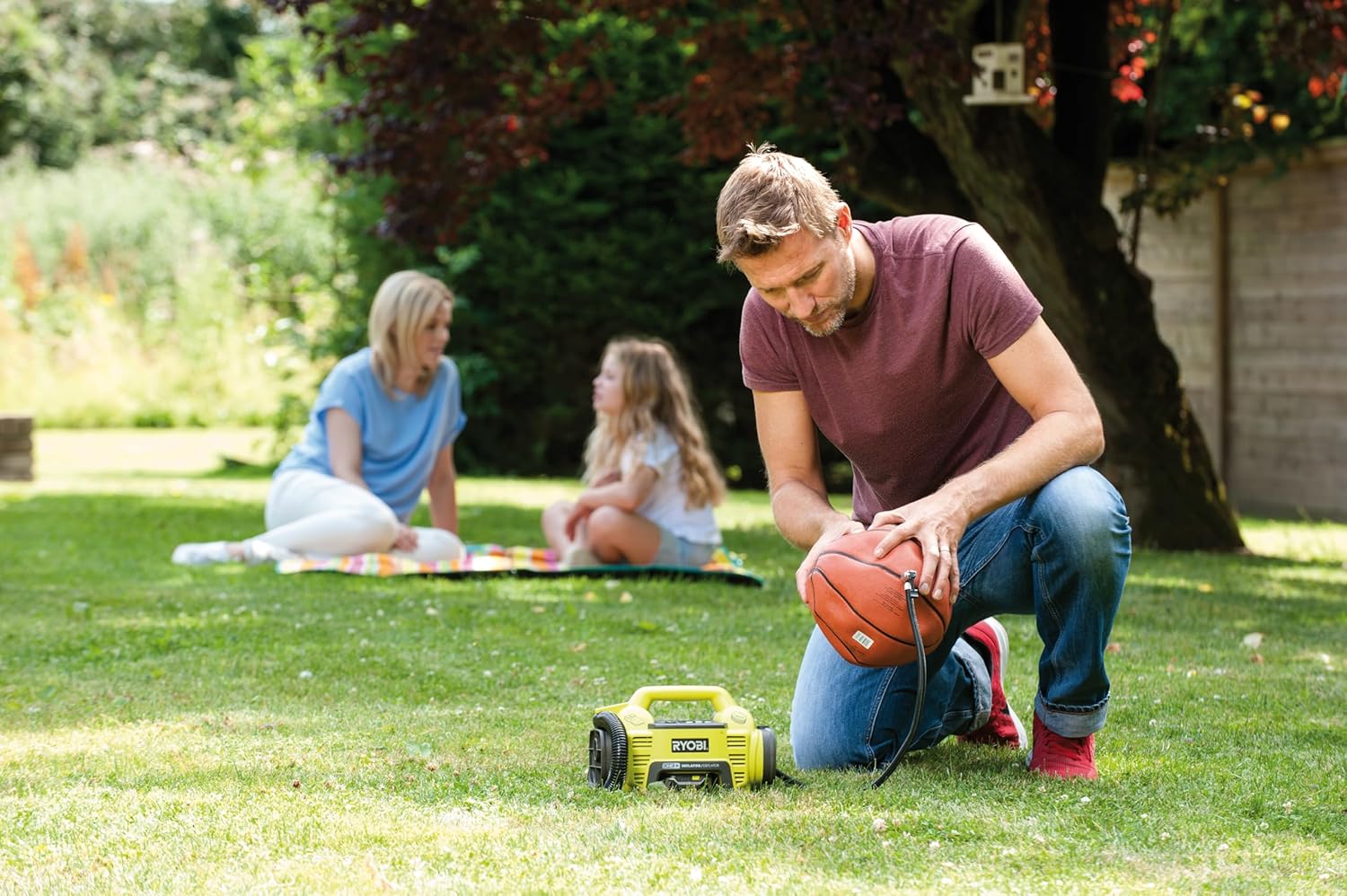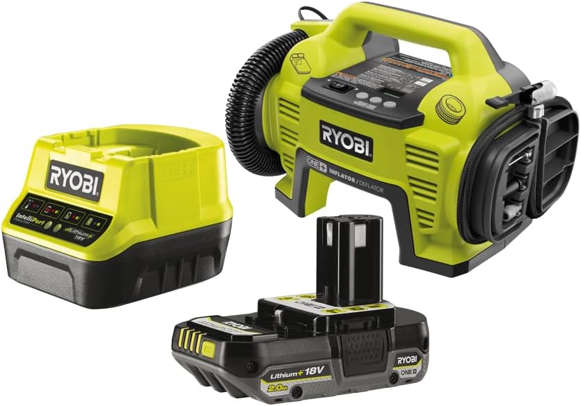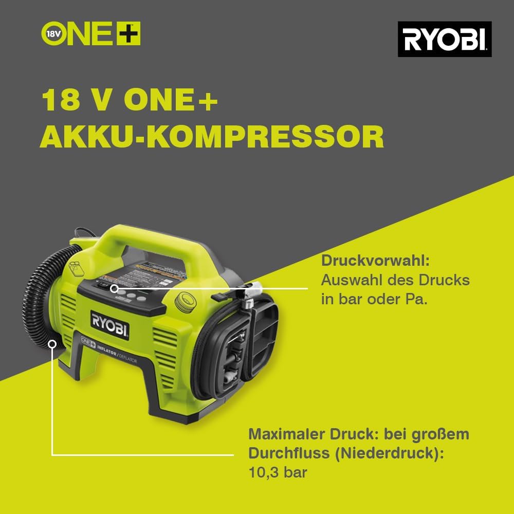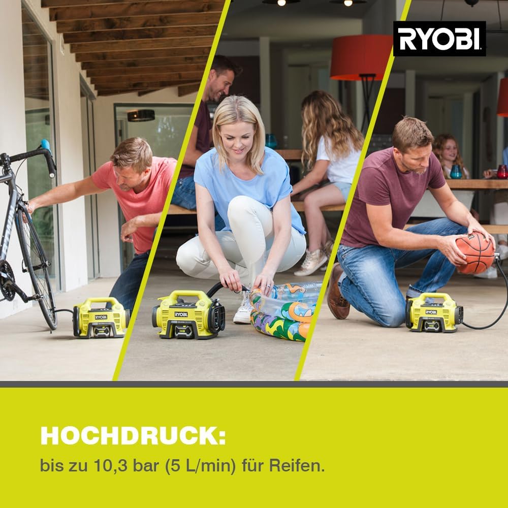 RYOBI 18 V ONE+ Akku-Multikompressor R18I-1C20GZL (max. Druck 10,3 bar, 2:1 Hochdruck-Inflationsdruck für Reifen und ein hohes Volumen für aufblasbare Gegenstände inkl. 2,0 Ah Akku und Ladegerät) | قیمت یورویی 130€