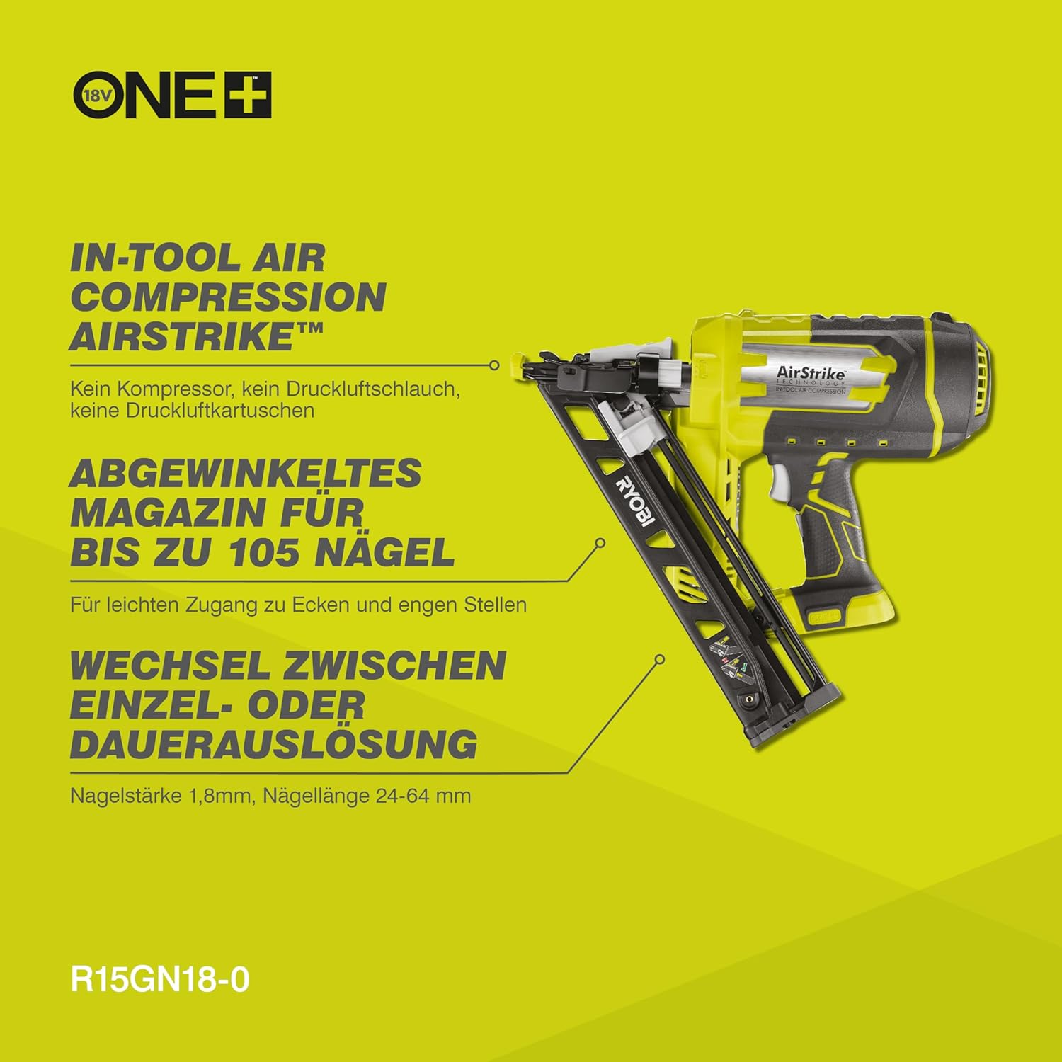 RYOBI 18 V ONE+ Akku-Nagler R15GN18-0 (Nageltyp 1,8 mm, Magazinkapazität von 105 Nägeln, 33-35° Magazinwinkel, inkl. 100 x angewinkelte Nägel, 1 x Gürtelclip, ohne Akku und Ladegerät) | قیمت یورویی 314.15€