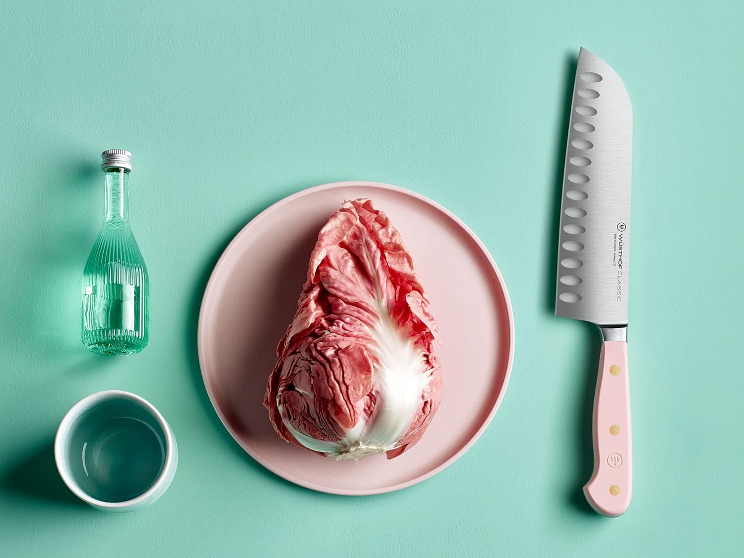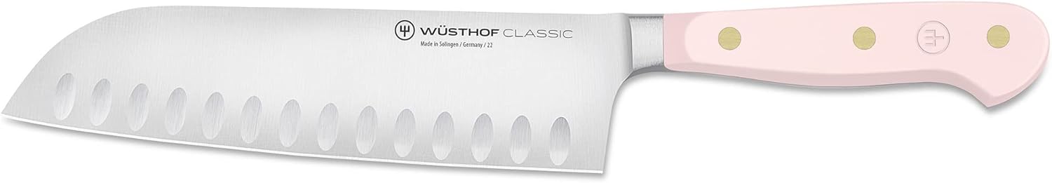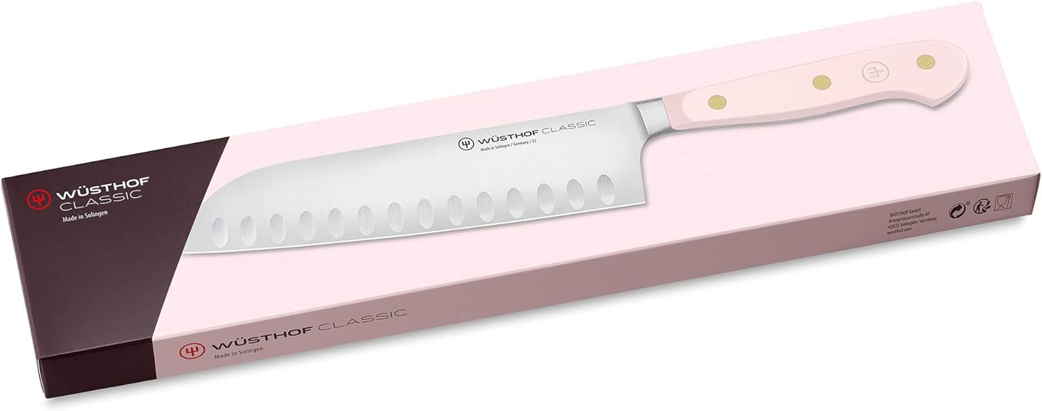 WÜSTHOF SANTOKU MESSER – Die scharfe Klinge des Santoku 17 cm ermöglicht Schnitte in normaler Breite bis hin zu hauchdünnen Streifen. Dieses Messer ist daher aus Küchen auf der ganzen Welt nicht mehr wegzudenken. MODERNES ORIGINAL – Unser ikonisches Messer mit weltweiter Fangemeinde gibt es nun mit farbigen Griffen – geblieben sind die charakteristischen Messingnieten. Pink Himalayan Salt kommt zart und verträumt daher und bringt Farbe in deine Küche. Einzigartig, lebendig und unverwechselbar, genau wie du. GESCHMIEDETES ASIA-MESSER – Das japanische Kochmesser ist besonders vielseitig: Wiegen, Hacken, Schneiden – macht hiermit einfach mehr Freude. Es wird aus einem Stück Edelstahl geschmiedet, ist mit 58° HRC und der durchgehenden Verlängerung unter dem Griff sehr stabil und liegt besonders ausgewogen in der Hand ANWENDUNG & PFLEGE – Um sicherzustellen, dass Ihr WÜSTHOF-Messer scharf bleibt, verwenden Sie die Klinge bitte nicht auf harten Oberflächen wie Glas, Keramik oder Metall. Messing kann sich mit der Zeit verfärben. Diese Verfärbung kann entfernt werden, indem Sie Backpulver und Zitronensaft auf die Stelle auftragen, 10 Minuten einwirken lassen und dann mit einem weichen Geschirrtuch abwischen. Nur von Hand reinigen. TRADITION SEIT 1814 – Wüsthof ist seit sieben Generationen in Familienbesitz und wurde vor über 200 Jahren in der Klingenstadt Solingen gegründet. Ein Markenmesser eines echten Traditionsunternehmens – geschmiedet in Solingen, Made in Germany | قیمت یورویی : 120.99€