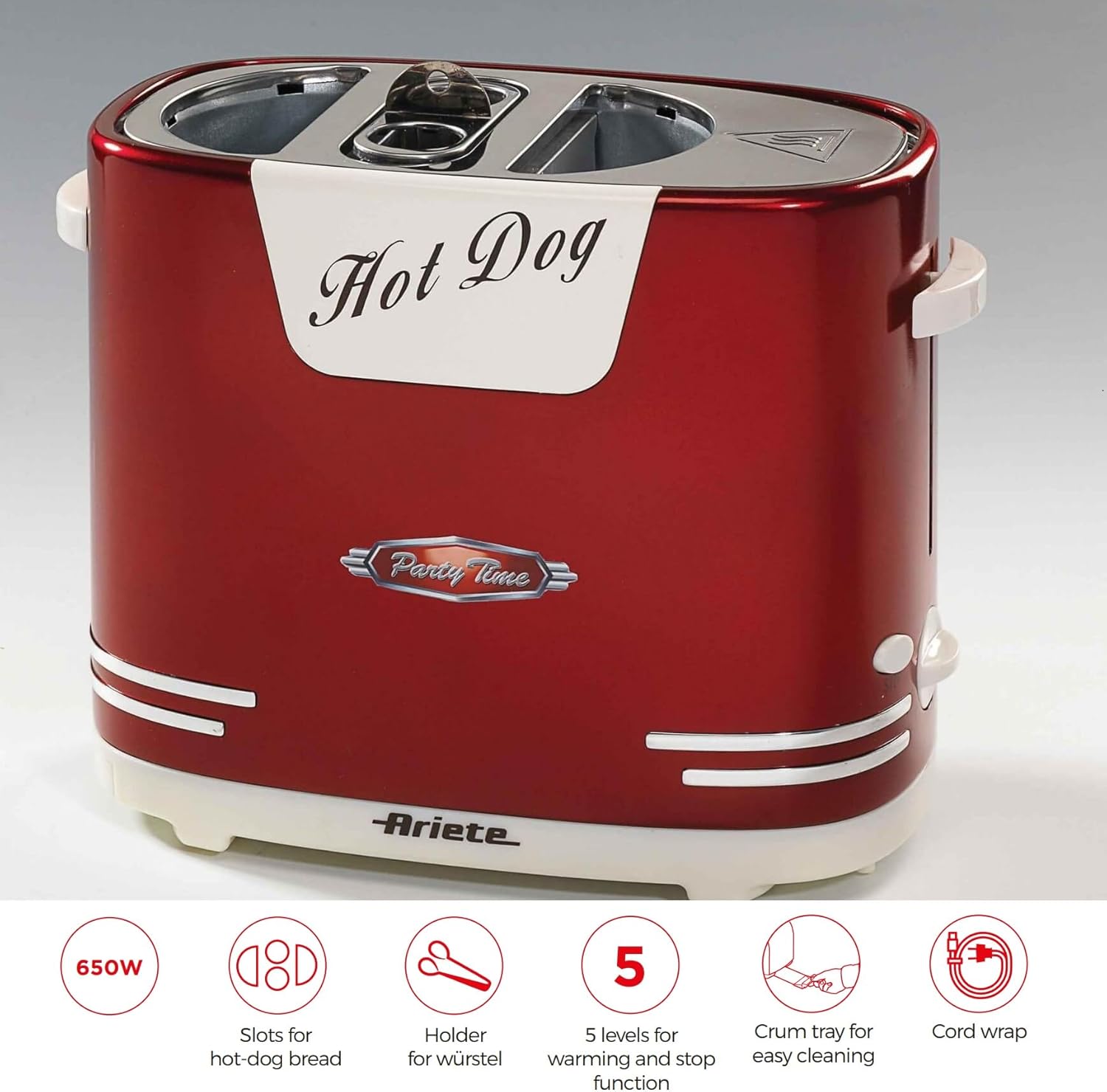 هات داگ ساز آریته مدل 186 دستگاهی جمع و جور و شیک با طراحی رترو است. این محصول برای تهیه سریع هات داگ در خانه یا محل کار ایده آل است.