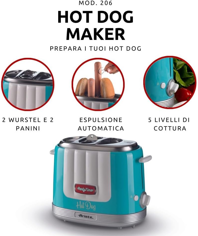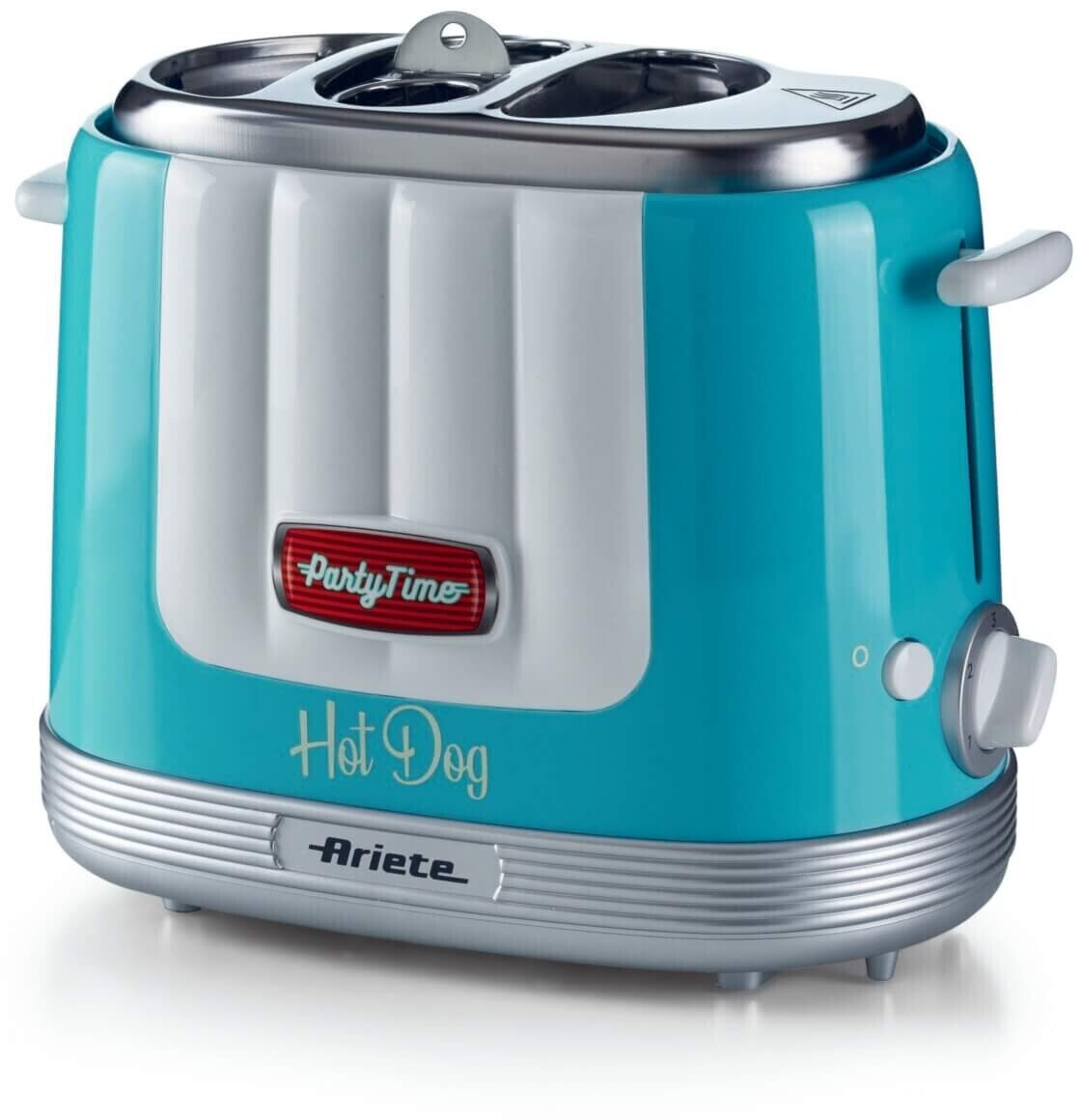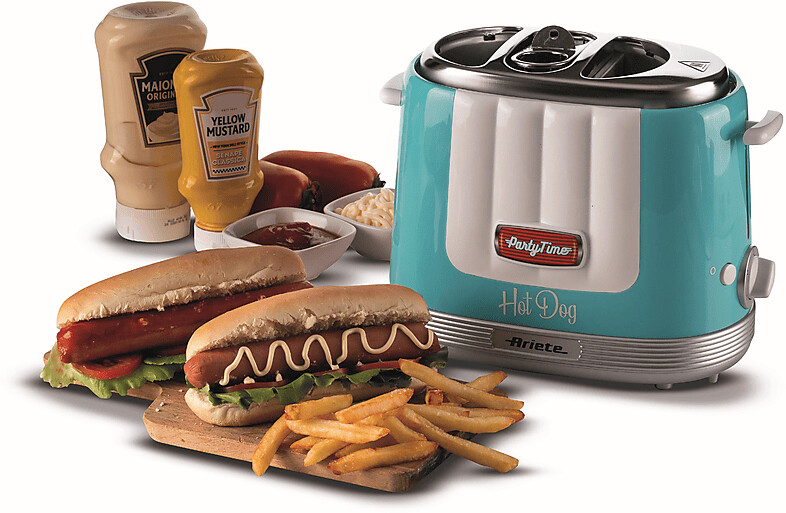 هات داگ ساز Ariete مدل 0206 از سری Party Time با طراحی شاد و رنگ آبی ، مناسب تهیه سریع و سرگرمکننده هات داگ خانگی است.