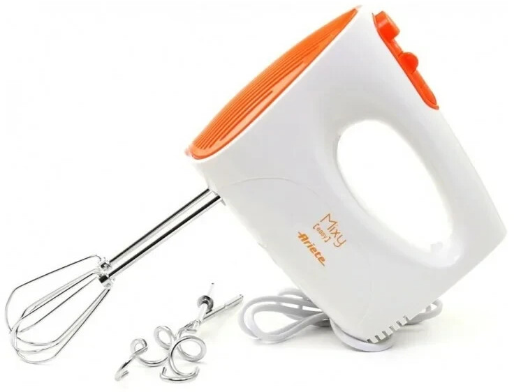 همزن برقی Ariete مدل 1541 با طراحی سبک، دسته ارگونومیک و رنگ سفید نارنجی، انتخابی مناسب برای تهیه خمیر و هم زدن مواد غذایی است.