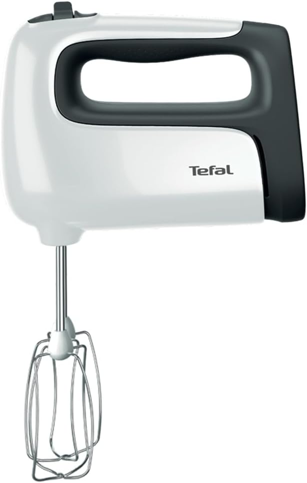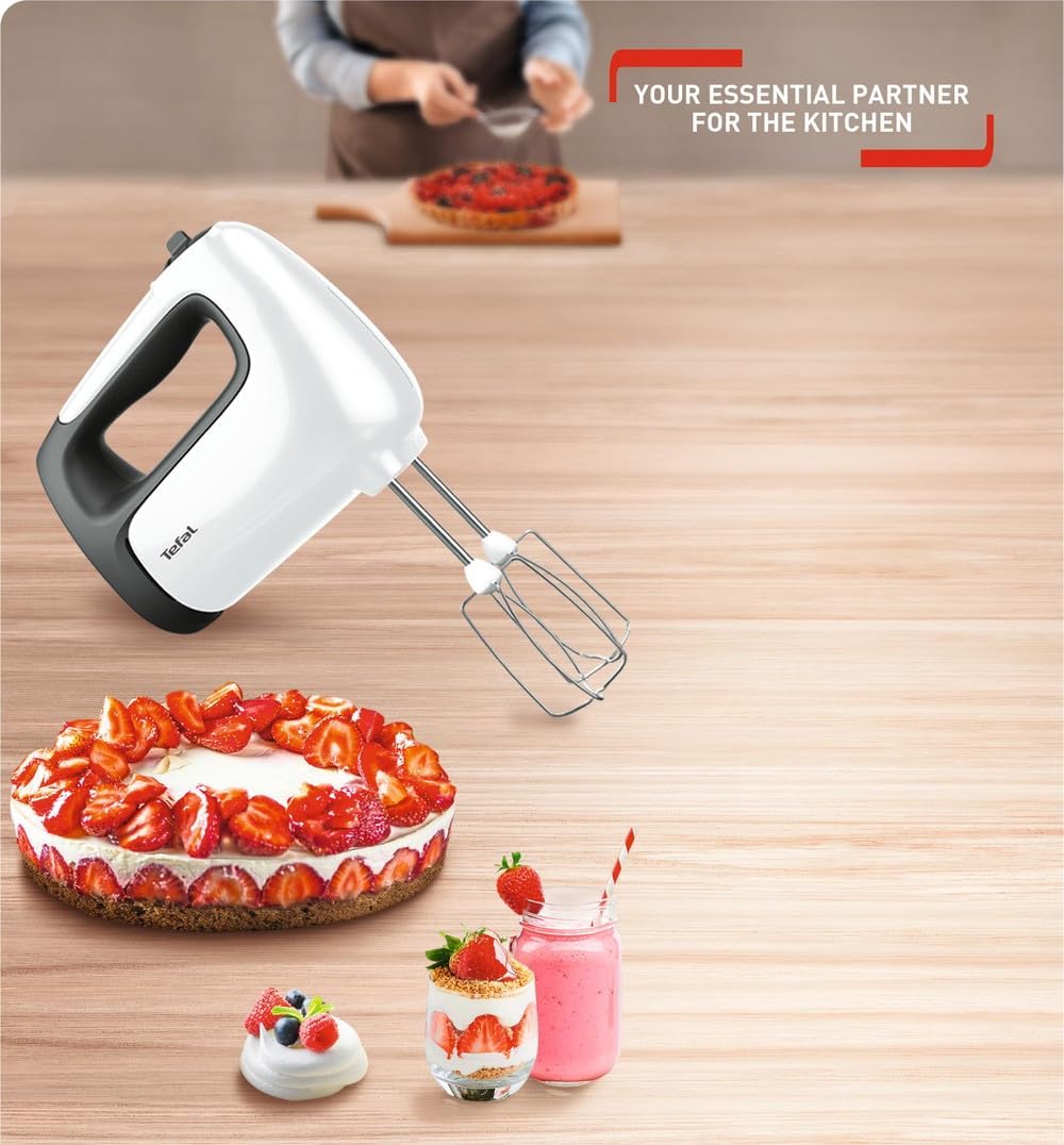 همزن دستی Tefal HT4611 Prep'Mix+ | 500 وات | دکمه کشویی با 5 سرعت + توربو | شامل لوازم جانبی: 2 همزن / 2 قلاب خمیر / چوب پوره / پیمانه اندازه گیری | سفید/سیاه
