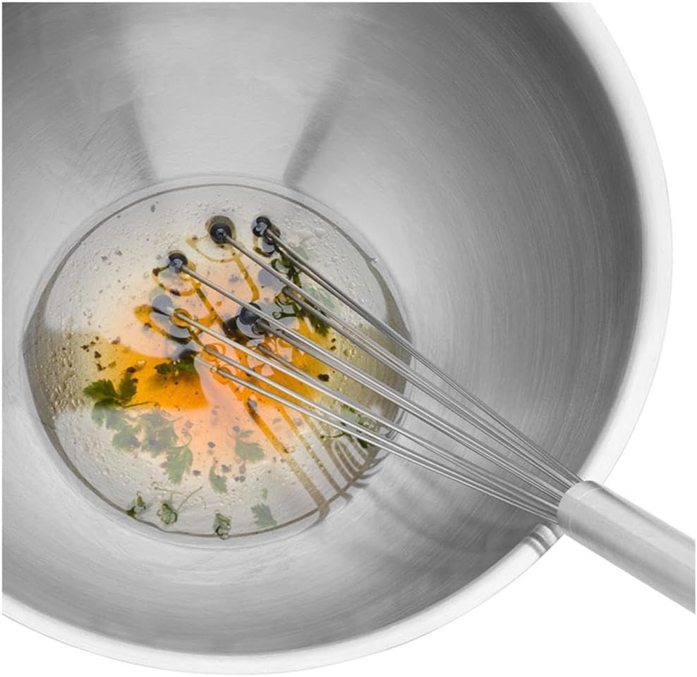 Inhalt: 1x Schneebesen Edelstahl mit Reduzierring und Silikon-Kugeln (Länge 32 cm) - Artikelnummer: 1876646030 Material: Cromargan Edelstahl 18/10, teilmattiert. Rostfrei, spülmaschinengeeignet, formstabil, hygienisch, säurefest und unverwüstlich. Silikon (hitzebeständig bis 270°C) Die flexiblen Drähte erreichen den äußersten Rand in Töpfen / Schüsseln. Dank der großen Aufschlagfläche der Kugeln kann am Topfboden nichts anhaften. Die Funktionsteile sind fest im Griff eingefasst Das Anrühren und Aufschlagen von Suppen/ Cremes gelingt in Sekunden: durch die schwingenden Kugeln gelangt sehr viel Luft unter die Rührmasse. Der Rührer kann in beschichtetem Töpfen verwendet werden Zwischen den Drähten bleibt nichts hängen, dadurch ist der Rührblitz leicht zu reinigen und hygienisch. Der integrierte Reduzierring ermöglicht es, die Drähte zu bündeln und platzsparend aufzubewahren | قیمت یورویی : 22€