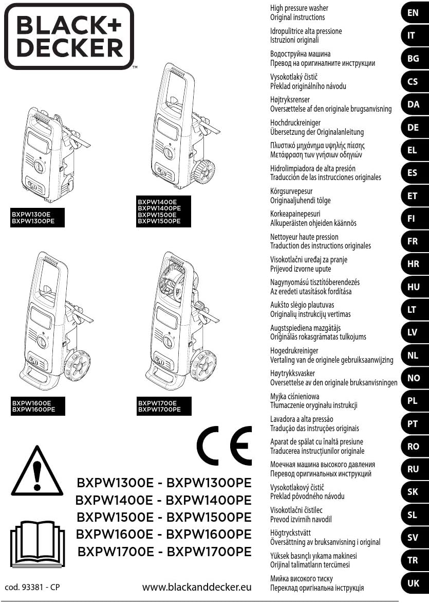 واشر فشار بلک + دکر BXPW1600PE (1600 وات، 125 بار، 420 لیتر در ساعت) با پاک کننده پاسیو و برس ثابت