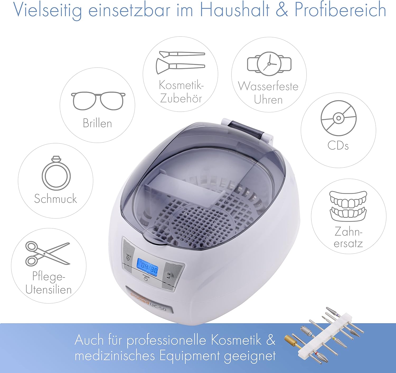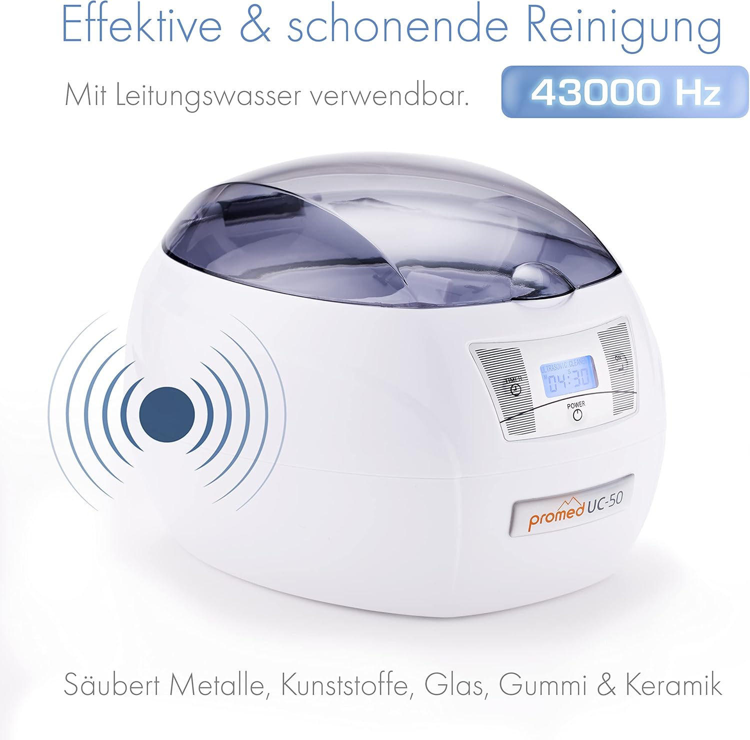 [43 kHz Ultraschallreinigung] Der Promed Brillen Ultraschallreiniger reinigt mit Ultraschallschwingungen selbst den kleinsten Schmutz von verschiedenen Oberflächen (Metalle, Kunststoffe, Glas, Gummi und Keramik). Herausnehmbarer Korb] Dank dem abnehmbaren Korb mit Uhren-, CD- und Bithalter sowie der maximalen Füllmenge von 550 ml ist unser Brillenreinigungsgerät für die effiziente Reinigung kleiner Gegenstände sowohl im Haushalts- als auch im Profibereich bestens geeignet. [Smarte Hochfrequenz-Renigung] Der Promed Schmuckreiniger Ultraschall überzeugt durch das smarte Design, das beleuchtete LCD-Display und die 5 Timerzeiten. Zudem ist das Ultraschall Reinigungsgerät sehr stabil und leise und schaltet sich nach Ablauf des Timers automatisch aus. [Vielseitige Anwendungsbereiche] Wollen Sie Ihre Ohrringe sauber machen oder Ihre Brillen reinigen? Das Promed UC-50 ist nicht nur als Ultraschallreinigungsgerät Schmuck oder Brillen Reinigungs Gerät geeignet, sondern auch für Rasierköpfe, Zahnersatz, Zahnspangen, Schmuck, wasserdichte Uhren, Linsen und andere zahnärztliche sowie chirurgische Instrumente. [Lieferumfang] 1x Korb mit Uhrenhalter, 1x CD-Halter, 1x Bithalter, 1x Gerät UC-50 (Timerzyklen 1:30, 3:00, 4:30, 6:00 und 7:30 min, Ultraschallfrequenz 43kHz, Gewicht ca. 842g, Maximale Füllmenge 550 ml) | قیمت یورویی : 39.75€