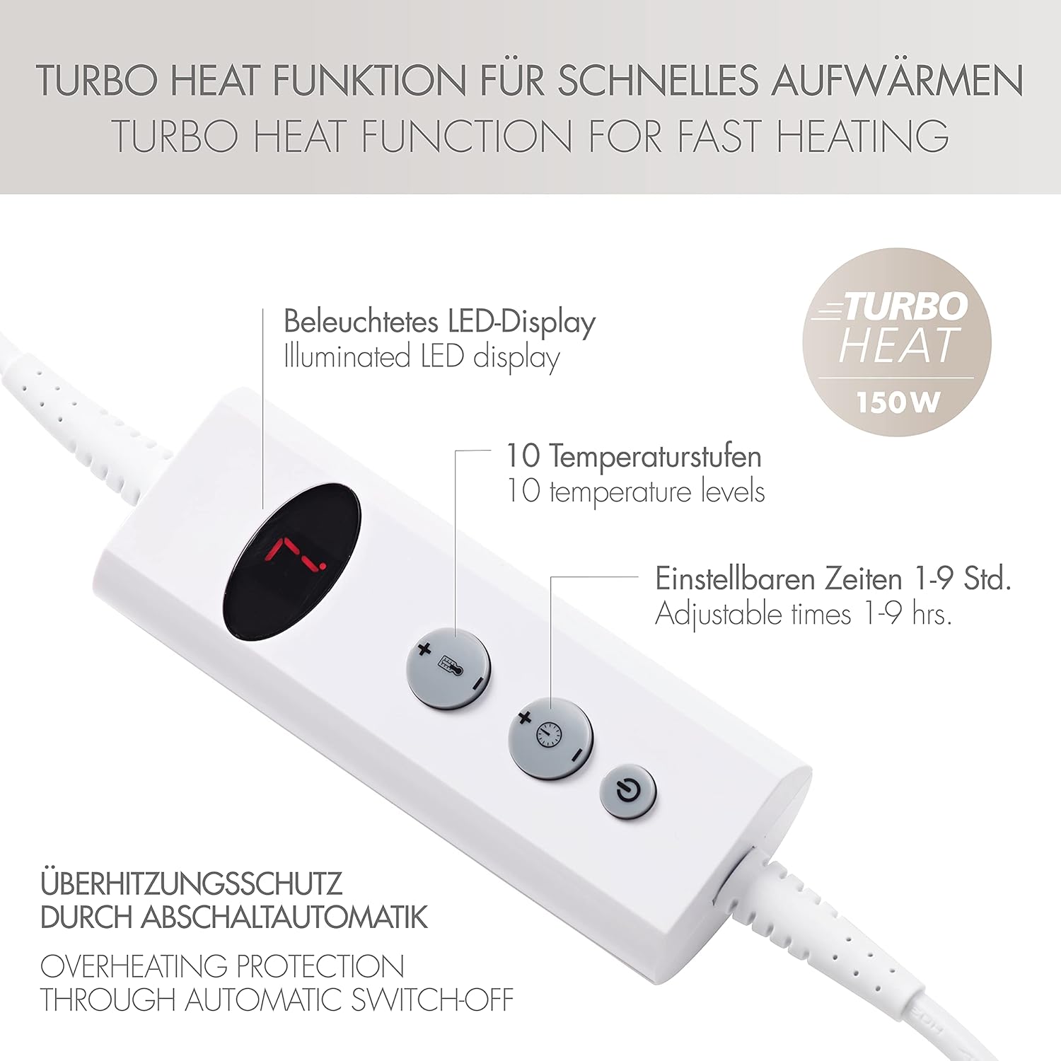 [Kuschel Heizdecke gemütlich & weich] Die beheizbare Decke besteht aus 100 % Polyester Flanell, welches anschmiegsam flauschig und weich ist. Durch die Größe ca. 180x130 cm ist unsere Promed KHP-2.3 eine besonders kuschelige und warme Decke - ideal für kalte Nächte und kalte Wintertage. [Wohltuende & entspannende Wärme] Lindern Sie kalte Füße, Erkältungen oder Gliederschmerzen wirksam durch unsere Wärme Heizdecke. Diese kann gefaltet auch als Heizkissen für Rücken Schulter und Nacken eingesetzt werden. Verwöhnen Sie sich, nach kurzer Aufwärmzeit, mit angenehmer Wärme! [Pflegeleicht & ausgezeichnete Qualität] Dank dem abnehmbaren Schalter ist unsere Heizdecke waschbar: Entweder von Hand oder in der Waschmaschine mit Feinwaschmittel bei 40 °C. Zudem ist unsere Heizdecke Testsieger im Vergleichstest – pflegeleichte Premium-Qualität! [Einfache & sichere Bedienung] Die Promed Heating Blanket KHP-2.3 mit Abschaltautomatik schaltet sich durch das integrierte Sicherheitssystem nach gewählter Zeiteinstellung von selbst ab. Zudem besitzt unsere Heizdecke 10 individuell einstellbare Temperaturstufen mit elektronischer Temperaturregelung und 9 verschiedene einstellbare Zeiten (1-9 Stunden). [Lieferumfang & technische Daten] 1x Bedienelement, 1x Gebrauchsanleitung, 1x Promed Heizdecke KHP-2.3 mit Abschaltautomatik, Spannungsversorgung 220-240 V~ / 50 Hz, Nennleistung 150 W, Größe ca. 180x130 cm | قیمت یورویی : 56.35€