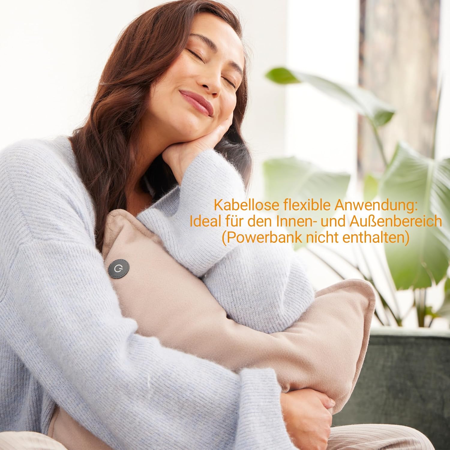 Wärme und Design: Das ansprechende Design und der kuschelige Stoffbezug machen das Kissen zu einem trendigen Wohnaccessoire, dass sich in jeden Wohnraum einfügt Infrarot-Wärmefunktion: Durch die integrierte Carbon-Faser mit Infrarot-Technologie wärmt das Heizkissen besonders tiefenwirksam, zudem sorgt der integrierte Überhitzungsschutz für eine bedenkenlose Anwendung Temperaturstufen: Über das Bedienfeld können Sie zwischen 3 Temperaturstufen wählen, das Wärmekissen ist außerdem mit einer Abschaltautomatik ausgestattet, welche die Wärmefunktion nach 20 Minuten ausschaltet Für Unterwegs: Dank der kabellosen Anwendung ist unser Wärmekissen perfekt für den Einsatz im Freien geeignet, eine Powerbank lässt sich einfach in der seitlichen verstecken Tasche aufbewahren Lieferumfang: Unser Heizkissen wird ohne Powerbank geliefert, da es mit jeder handelsüblichen Powerbank mit USB-A-Anschluss kompatibel ist – so können Sie flexibel eine Powerbank Ihrer Wahl nutzen, die Sie wahrscheinlich bereits zu Hause haben | قیمت یورویی : 63.99€
