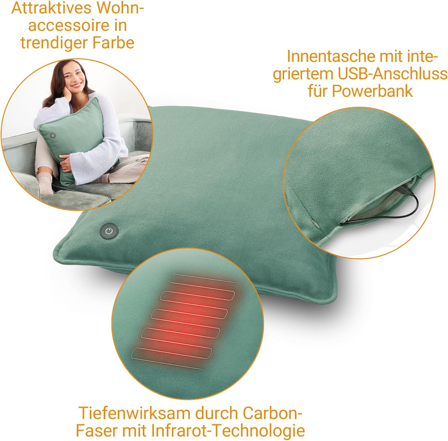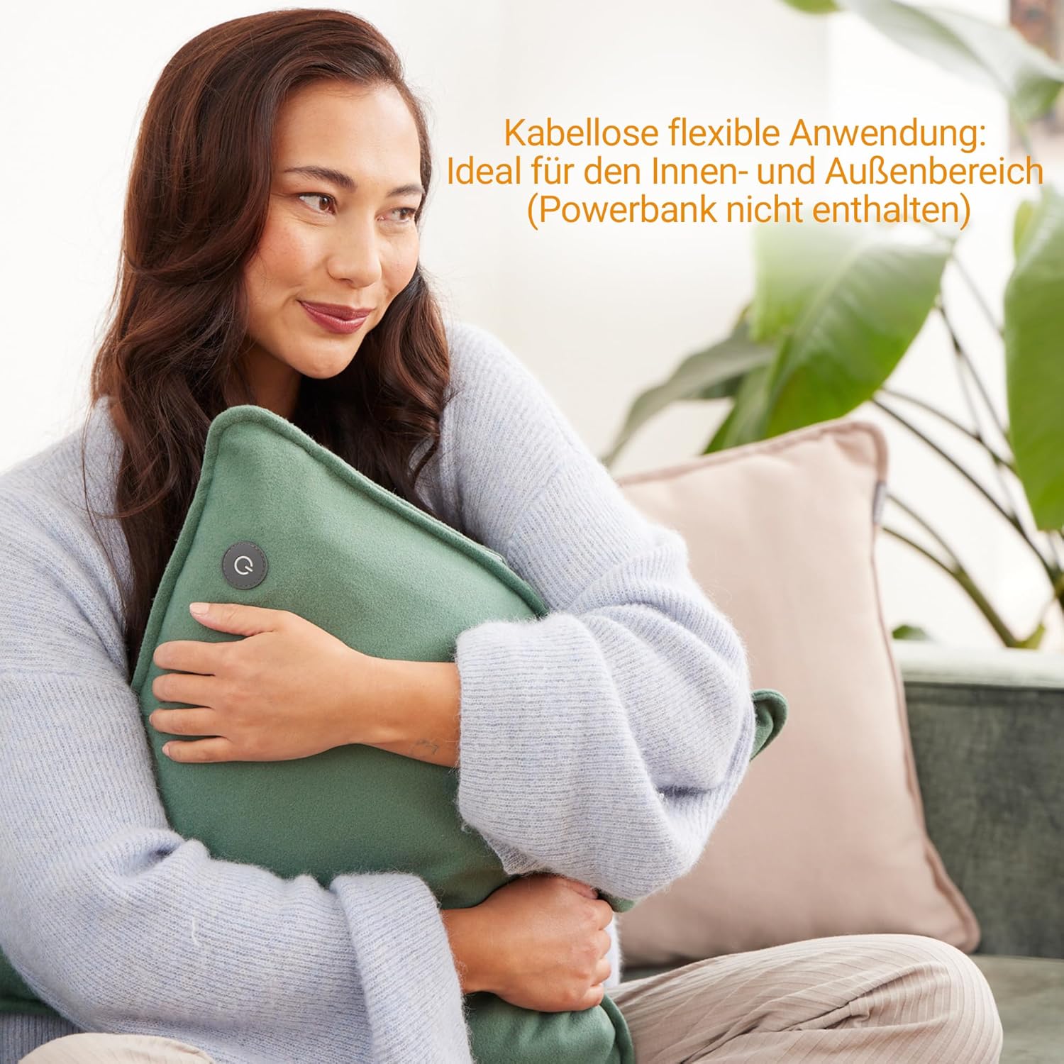 Wärme und Design: Das ansprechende Design und der kuschelige Stoffbezug machen das Kissen zu einem trendigen Wohnaccessoire, dass sich in jeden Wohnraum einfügt Infrarot-Wärmefunktion: Durch die integrierte Carbon-Faser mit Infrarot-Technologie wärmt das Heizkissen besonders tiefenwirksam, zudem sorgt der integrierte Überhitzungsschutz für eine bedenkenlose Anwendung Temperaturstufen: Über das Bedienfeld können Sie zwischen 3 Temperaturstufen wählen, das Wärmekissen ist außerdem mit einer Abschaltautomatik ausgestattet, welche die Wärmefunktion nach 20 Minuten ausschaltet Für Unterwegs: Dank der kabellosen Anwendung ist unser Wärmekissen perfekt für den Einsatz im Freien geeignet, eine Powerbank lässt sich einfach in der seitlichen verstecken Tasche aufbewahren Lieferumfang: Unser Heizkissen wird ohne Powerbank geliefert, da es mit jeder handelsüblichen Powerbank mit USB-A-Anschluss kompatibel ist – so können Sie flexibel eine Powerbank Ihrer Wahl nutzen, die Sie wahrscheinlich bereits zu Hause haben | قیمت یورویی : 63.99€