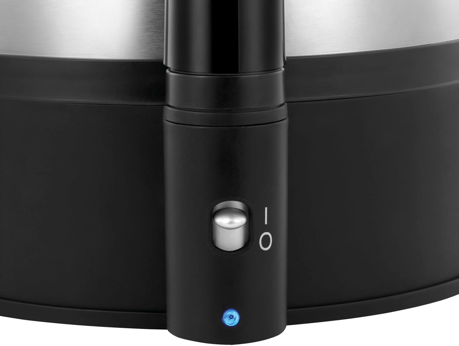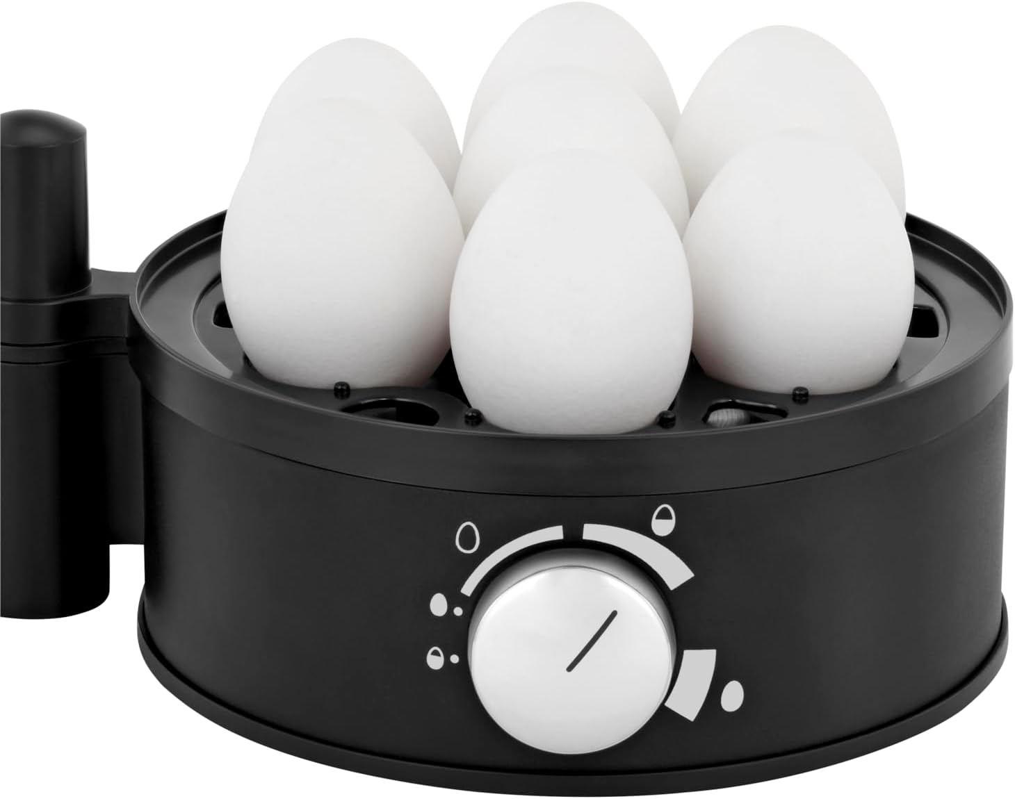Inhalt: 1x Eierkocher aus Cromargan Edelstahl matt (17,5 x 20 x 15 cm, 380 W, Kabellänge 0,94m) mit Kunststoff-Halter und Edelstahlheizplatte, 1x Messbecher mit Eipick - Artikelnummer: 0415070011 Der Eierkocher, mit herausnehmbarem Eierhalter, ermöglicht ein energiesparendes Kochen von 1-7 Eier. Die Kochzeit wird über die Zeituhr geregelt, so ist kein Abmessen der Wassermenge notwendig Gleichzeitiges, punktgenaues Zubereiten der Eier durch die wählbaren Härtegrade (weich, mittel und hart) über einen Drehknopf. Ein Signalton informiert, wann der Härtegrad erreicht ist Die Fortkochstufe ermöglicht das Eier Kochen mit unterschiedlichen Härtegraden in einem Kochprozess: sind die weichen Eier fertig, diese entnehmen und die restlichen Eier einfach weiter garen lassen Leichte Reinigung des Kochers mit warmem Wasser und feuchtem Tuch. Deckel und Eierhalter können in der Spülmaschine gereinigt werden. Praktische Kabelaufwicklung am Boden | قیمت یورویی : 29.9€