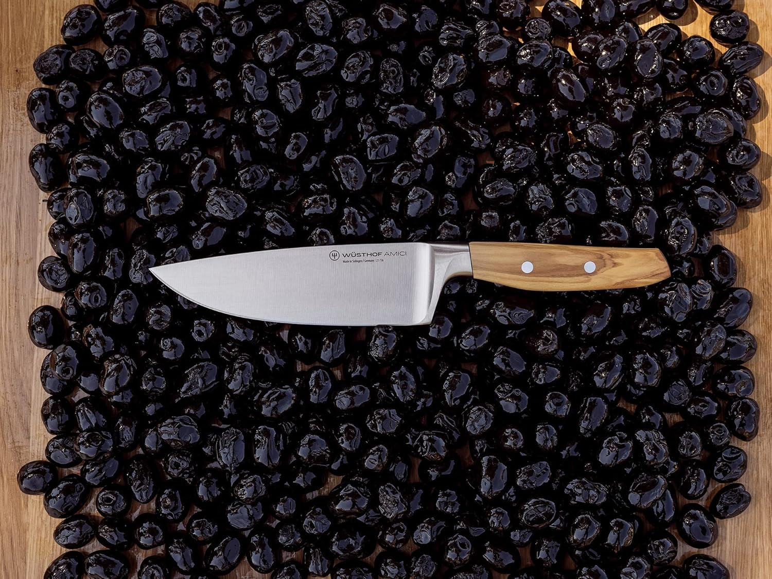 Markanter Olivenholz-Griff, geschwungene Linienführung, harmonisch und charakterstark – daran erkennt man die kalabrischen Wurzeln der Amici Messer-Serie. In diesem Allroundmesser trifft moderne Handwerkskunst auf italienische Leichtigkeit Durch 16 cm Klingenlänge ist das Allzweckmesser besonders handlich und wendig – das ideale Multitalent zum Schneiden, Hacken und Wiegen. Dabei erleichtert die breite, sehr scharfe Klinge dieses Chefmessers für Köche das sichere Führen des Profi Messers Jedes Amici Küchenmesser ist ein elegantes Original. Das liegt an der individuellen Maserung der ergonomischen Griffe aus nachhaltiger, kalabrischer Olive – ein langsam wachsender Baum, dessen Holz von Natur aus wasserabweisend und antibakteriell ist Die sehr scharfe Klinge dieses Chefmessers (Profi Kochmesser) wird in unserem Werk in Solingen aus einem Stück Wüsthof Stahl geschmiedet. Sie ist rostbeständig, zäh sowie hart und erhält in Handarbeit ihren präzisen Feinschliff und finale Schärfe Dank des offenen Griff-Designs liegen die Olivenholz-Messer bei kleinen wie großen Händen ideal in der Hand und laden ein, besondere kulinarische Momente zu genießen. Ein Markenmesser eines echten Traditionsunternehmens: Wüsthof Messer – Made in Solingen | قیمت یورویی : 200€