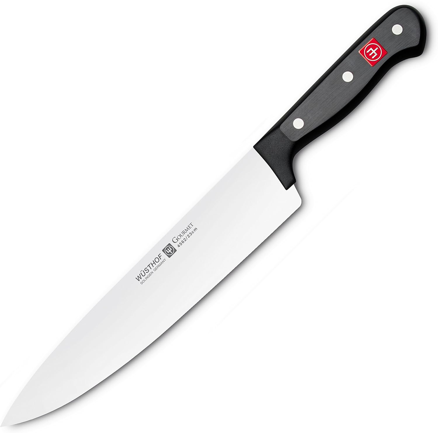 Mit Gourmet hat Wüsthof Messer Basics im Angebot, die als scharfe Küchenmesser nicht nur durch richtig gute Qualität und einen günstigen Preis begeistern, sondern als zuverlässige Solinger Messer – so wie dieses vielseitige Universalmesser für alle Köche Breite, ultrascharfe Klinge (23cm) – das größere, robuste Chefmesser ist ein echter Alleskönner. Als präzises Allzweckmesser ist das scharfe Kochmesser ideal zum kraftvollen Schneiden, Hacken, Wiegen und Transportieren größerer Lebensmittel Scharf und stabil – die ausgelaserte Messerklinge wird in 35 Arbeitsgängen so verarbeitet, dass sie durch eine Härte von 56° Rockwell und der Verlängerung unter dem Griff mit der Stabilität und Schärfe geschmiedeter Profi Kochmesser vergleichbar ist Agil und spülmaschinengeeignet – der ergonomische Griff ist 3-fach vernietet und absolut pflegeleicht. Dank des geringen Gewichts ermöglicht das Profimesser (Kochmesser 23 cm) präzises, schwungvolles Schneiden – und echte Entspannung bei jedem Schnitt Wüsthof Gourmet überzeugt durch ein sehr gutes Preis-Leistungsverhältnis und ist als Starterset für den Privat-Haushalt ebenso interessant wie als Grundausstattung für die Gastronomie (Profiküche). Küchen Messer – Made in Germany, hergestellt in Solingen | قیمت یورویی : 74.9€
