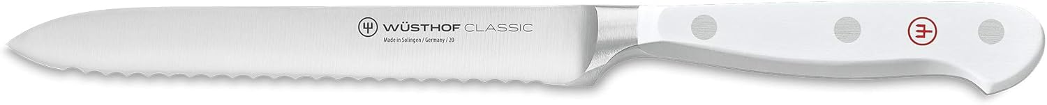 Die Wüsthof Classic White Messerserie verbindet mit ihren einzigartigen, weißen Griffen moderne Leichtigkeit mit bester Qualität. So sind die hochwertigen Messer aus Solingen das elegante Extra in jeder Küche – z.B. dieses kleine Brotmesser (Säge-Messer) Tisch-Messer mit Welle – dank der scharfen Klinge mit Spezialwellenschliff schneidet das Brotzeit-Messer (Brötchenmesser, Vespermesser) sauber durch weiche und harte Lebensmittel – optimal für Aufschnitt wie Wurst und Käse, Brot, Obst oder Tomaten Das kleine Universalmesser im klassischen Design ist ideal ausbalanciert, liegt gut in der Hand und unterstützt sicheres Schneiden. Der ergonomische Griff mit Fingerschutz ist fugenlos vernietet und pflegeleicht – ein sehr gutes Messer, super scharf Die ultra-scharfe Klinge mit Sägeschliff (Kochmesser Profi-Messer) wird aus Wüsthof Stahl (Qualitätsstahl) geschmiedet, im laserbasierten Schärfverfahren geschliffen und erhält per Hand ihren finalen Polierabzug – und somit ihre langanhaltende Schärfe Dieses weiße, hochwertige Qualitäts-Messer von Wüsthof ist optimal für die tägliche Küchenarbeit und ist auch eine schöne Geschenk-Idee. Ein zuverlässiges Profi-Küchenmesser eines echten Traditionsunternehmens – Made in Germany, geschmiedet in Solingen | قیمت یورویی : 81.98€