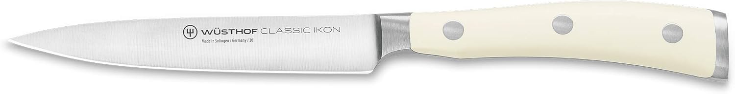 Mit den cremeweißen Griffen sind Wüsthof Messer der Classic Ikon Crème Serie ein eleganter Eyecatcher in der Küche. Dabei sorgt die anspruchsvolle Solinger Qualität bei der Anwendung für einen weiteren Wow-Effekt – richtig gute Kochmesser, zeitloses Design Wenn Gemüse, Kartoffeln, Zwiebeln oder Obst geschnitten oder geschält werden sollen, ist das wendige Officemesser mit schlanker Klinge (12cm) als Gemüse-, Obstmesser oder Schälmesser ein vielseitiges Allzweckmesser – auch für kurze Schnitte an Fleisch Das ideal ausbalancierte Kochmesser Profi-Messer aus Edelstahl wird im speziellen Schärfverfahren geschliffen, bevor die Messerklinge per Hand den finalen Polierabzug erhält und somit ihre beeindruckende Schärfe – für langanhaltende Präzision Durch die kleine Wölbung im vorderen Bereich liegt der ergonomische Griff besonders angenehm und sicher in der Hand. Die hellen, pflegeleichten Griffschalen sorgen für einwandfreie Hygiene und sehen nicht nur in weißen Küchen einfach gut aus Wüsthof Classic Ikon Creme ist das Lieblingsmesser der stilbewussten Köchin, das brillant gute Messer beeindruckt zugleich als offizielles Werkzeug der deutschen Nationalmannschaft der Köche. Qualitätsmesser – Made in Germany, geschmiedet in Solingen | قیمت یورویی : 99€