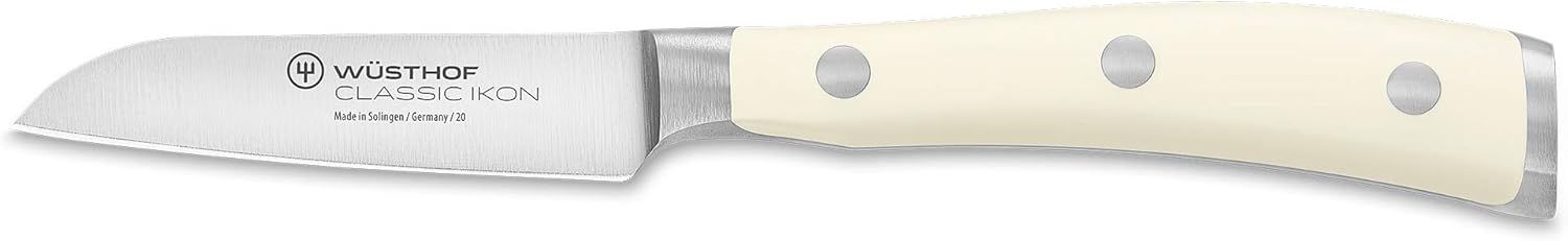 Mit den cremeweißen Griffen sind Wüsthof Messer der Classic Ikon Crème Serie ein eleganter Eyecatcher in der Küche. Dabei sorgt die anspruchsvolle Solinger Qualität bei der Anwendung für einen weiteren Wow-Effekt – richtig gute Kochmesser, zeitloses Design Das handliche, kurze Messer mit gerader Klinge (8 cm) ist ideal zum Bearbeiten von kleinem Obst, Gemüse und Kräutern. Als kleines Küchenmesser überzeugt das sehr scharfe Allzweckmesser (Gemüse-, Obstmesser, Schälmesser) durch seine große Vielseitigkeit Das ideal ausbalancierte Kochmesser Profi Messer aus Edelstahl wird im speziellen Schärfverfahren geschliffen, bevor es per Hand den finalen Polierabzug erhält und somit seine beeindruckende Schärfe – für langanhaltende Präzision bei jedem Schnitt Durch die kleine Wölbung im vorderen Bereich liegt der ergonomische Griff besonders angenehm und sicher in der Hand. Die hellen, pflegeleichten Griffschalen sorgen für einwandfreie Hygiene und sehen nicht nur in weißen Küchen einfach gut aus Wüsthof Classic Ikon Creme ist das Liebling-Küchenzubehör der stilbewussten Köchin, das sehr gute Messer beeindruckt zugleich als offizielles Werkzeug der deutschen Nationalmannschaft der Köche. Qualitätsmesser – Made in Germany, geschmiedet in Solingen | قیمت یورویی : 89€